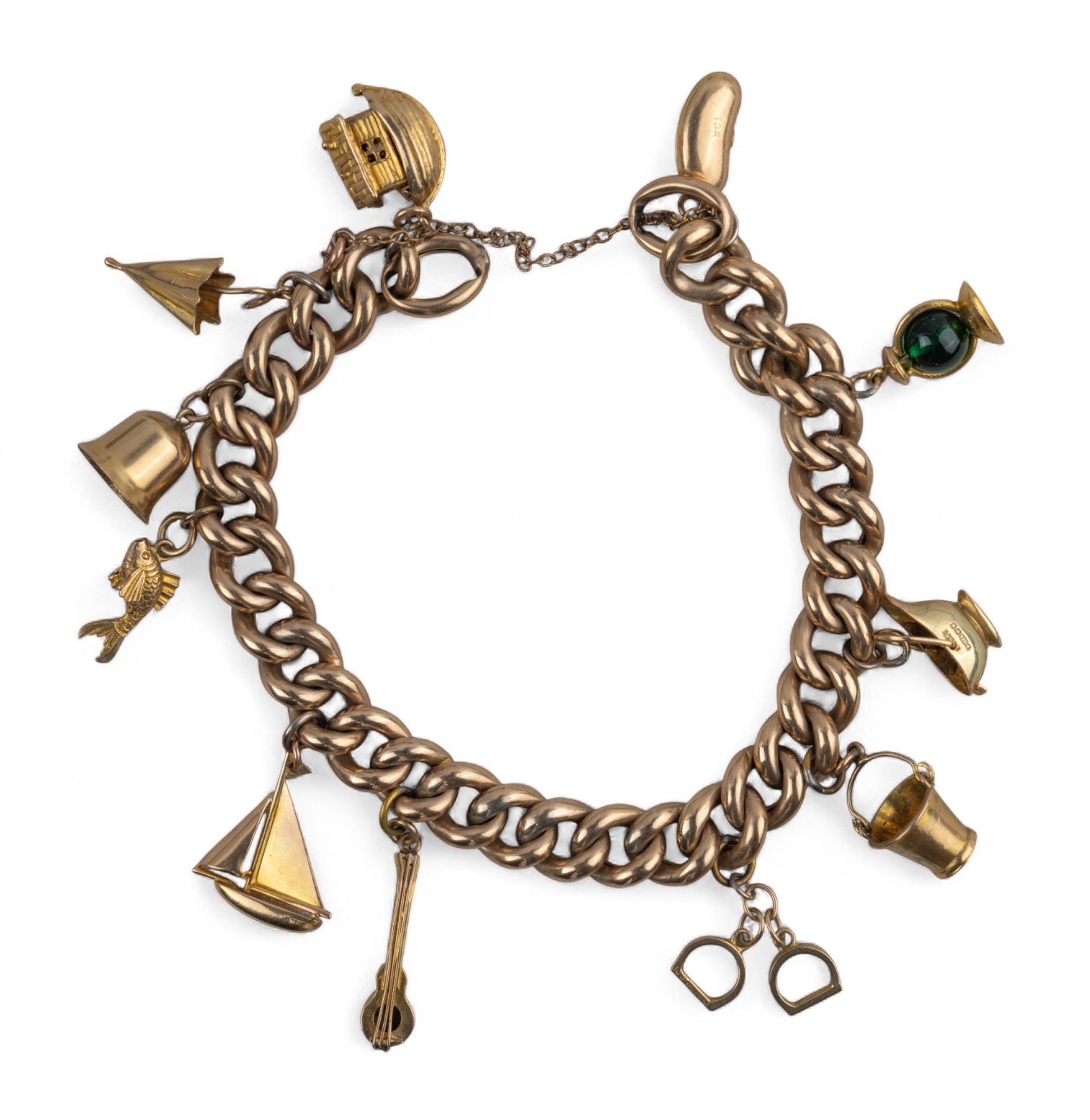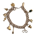 The curb-link bracelet applied with eleven various charms including a guitar, a Noah's arch, and a bucket.
