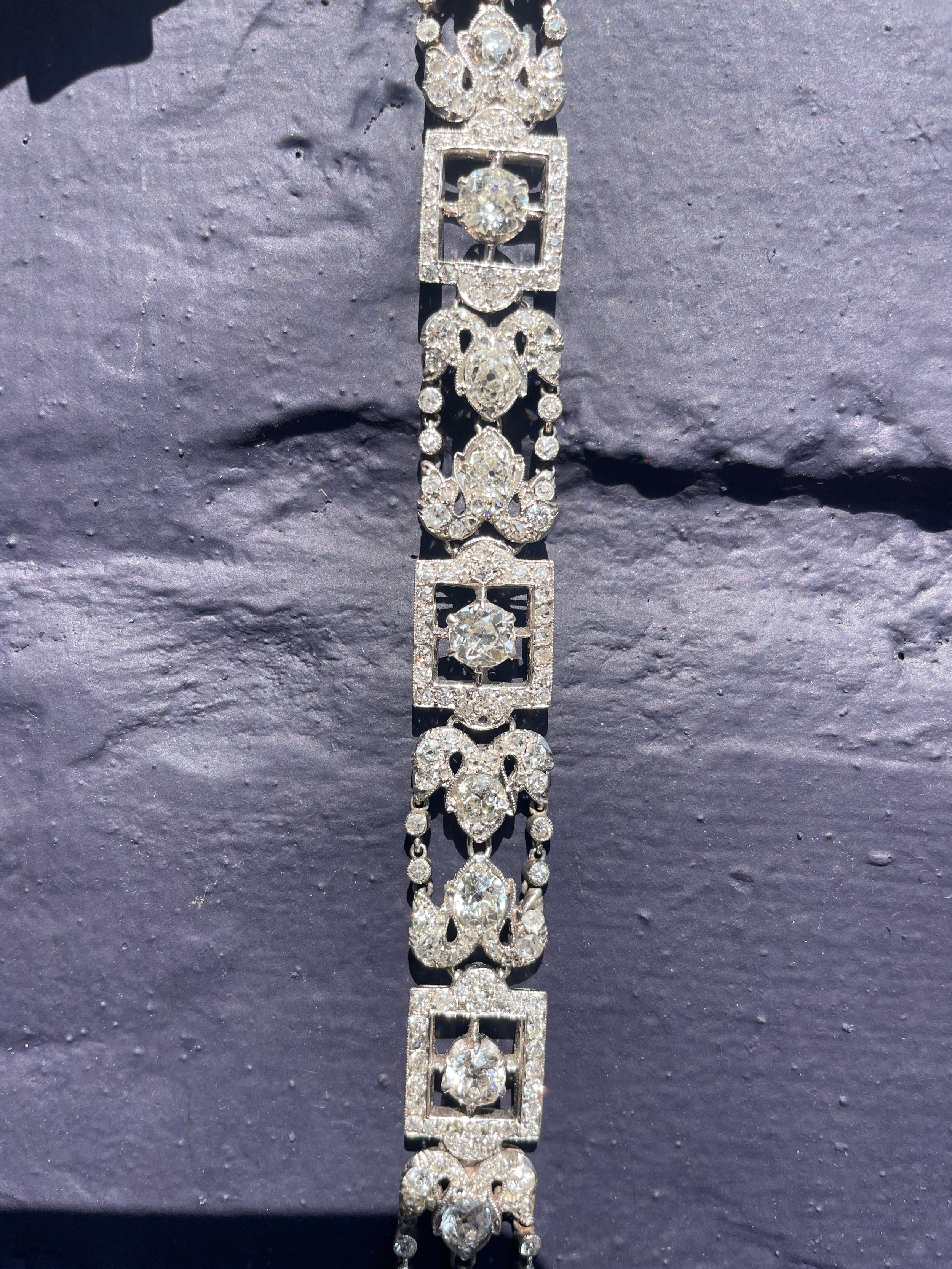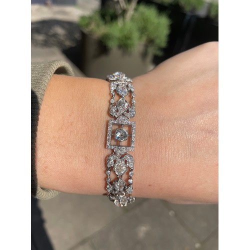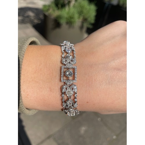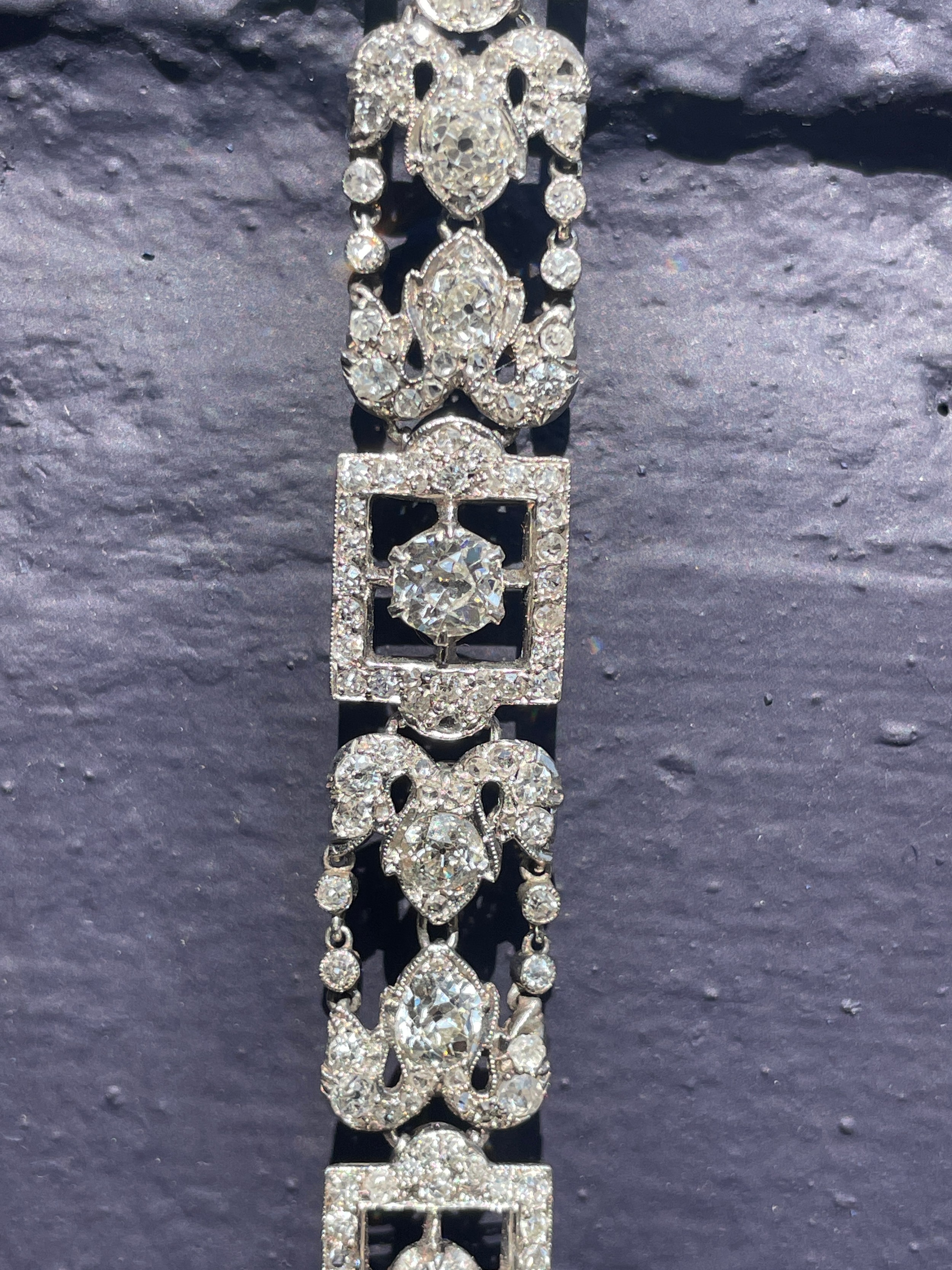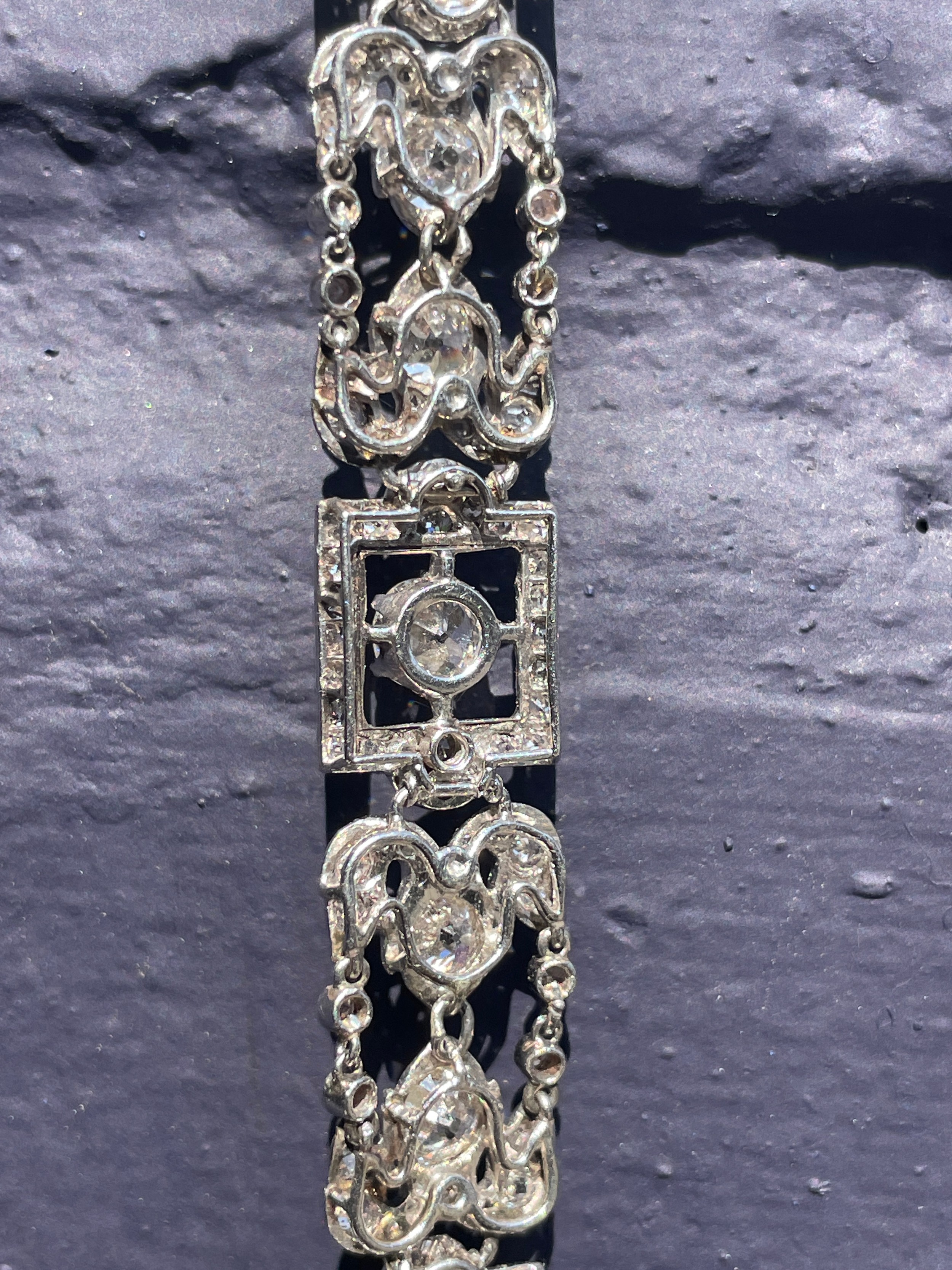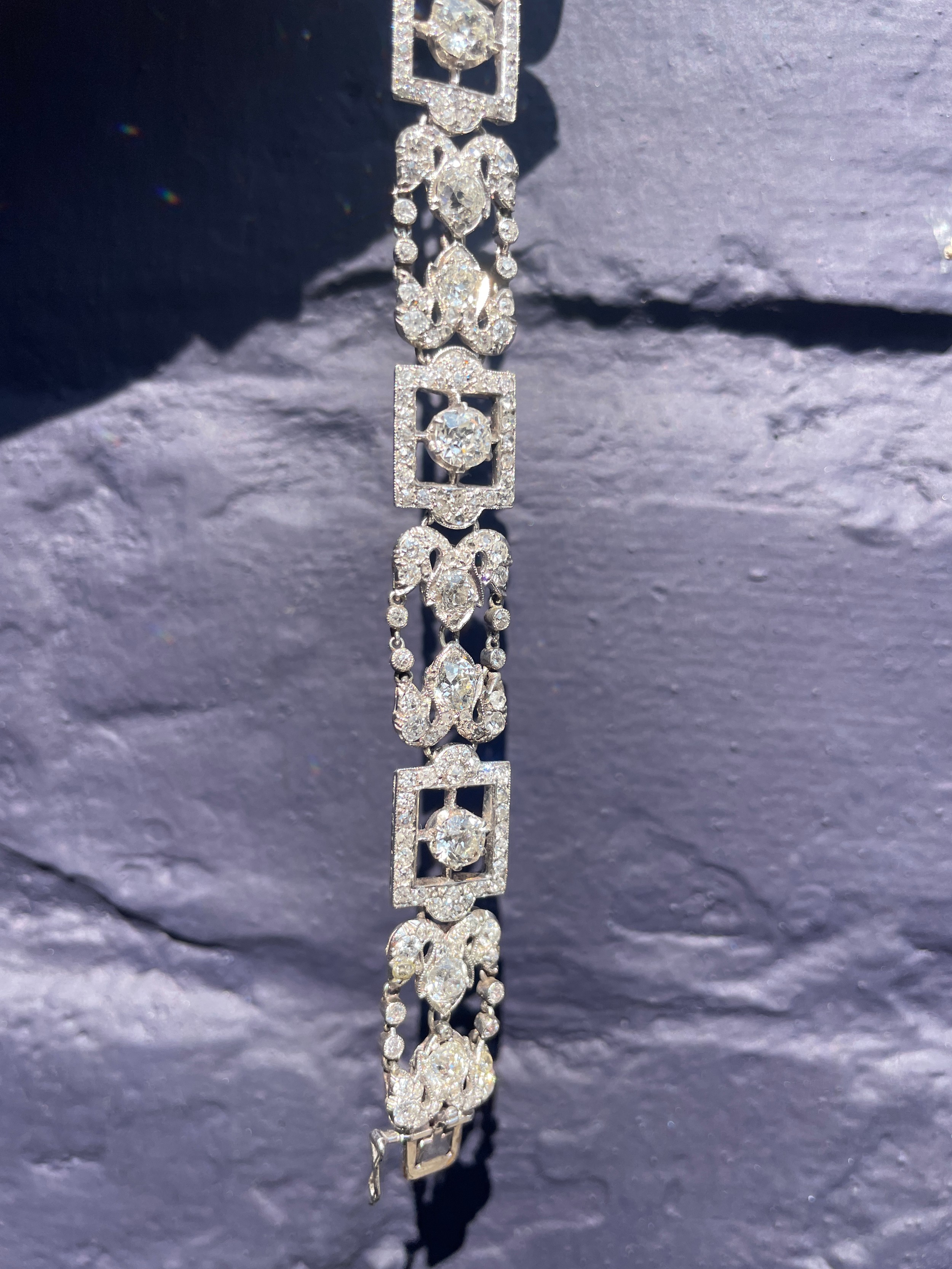 A beautiful Belle Époque diamond bracelet. Composed of square shaped sections with single old brilliant cut diamond centres. With highly flexible bell flower garland connecting links. Finely mounted in platinum, with French control marks