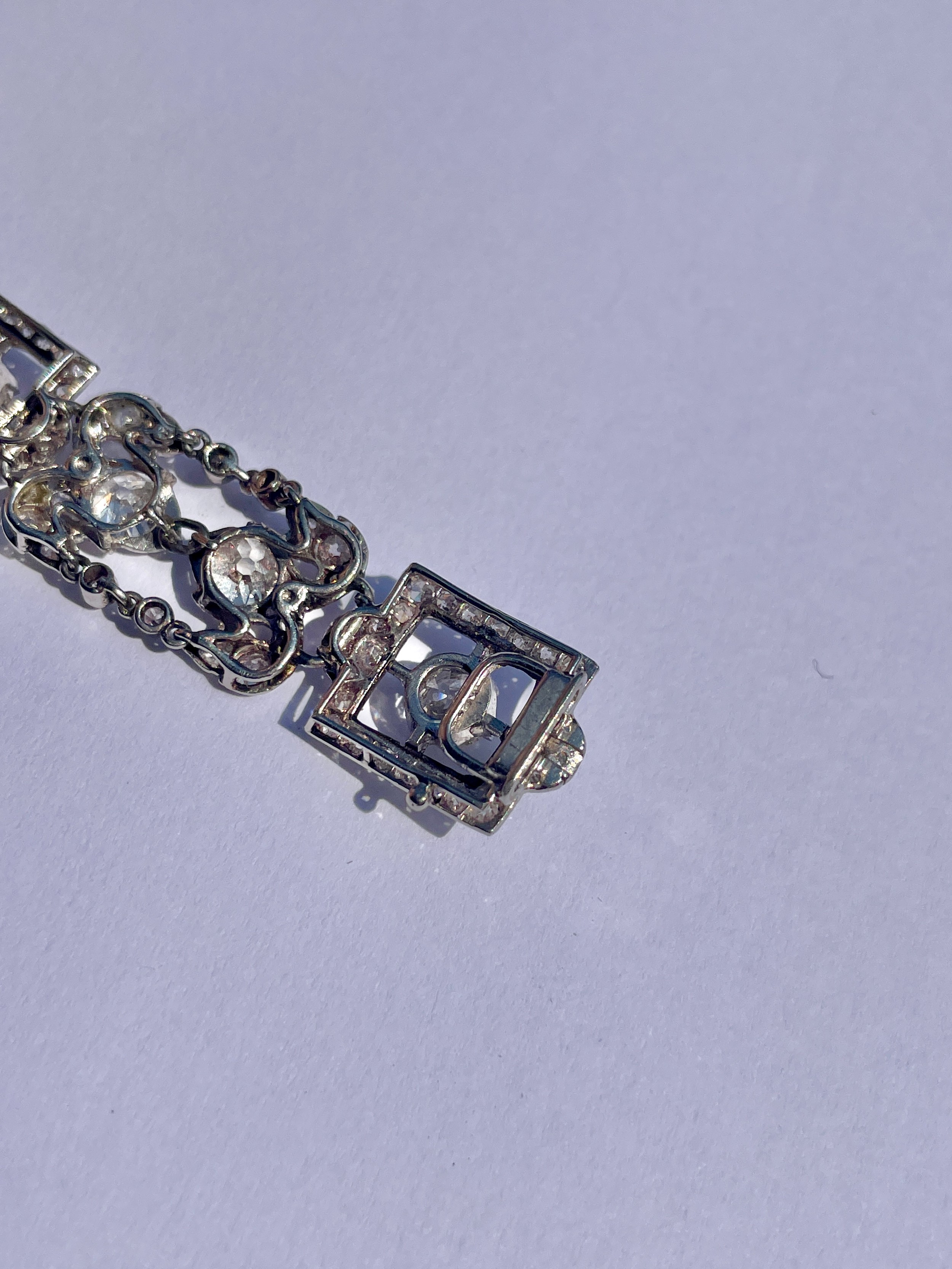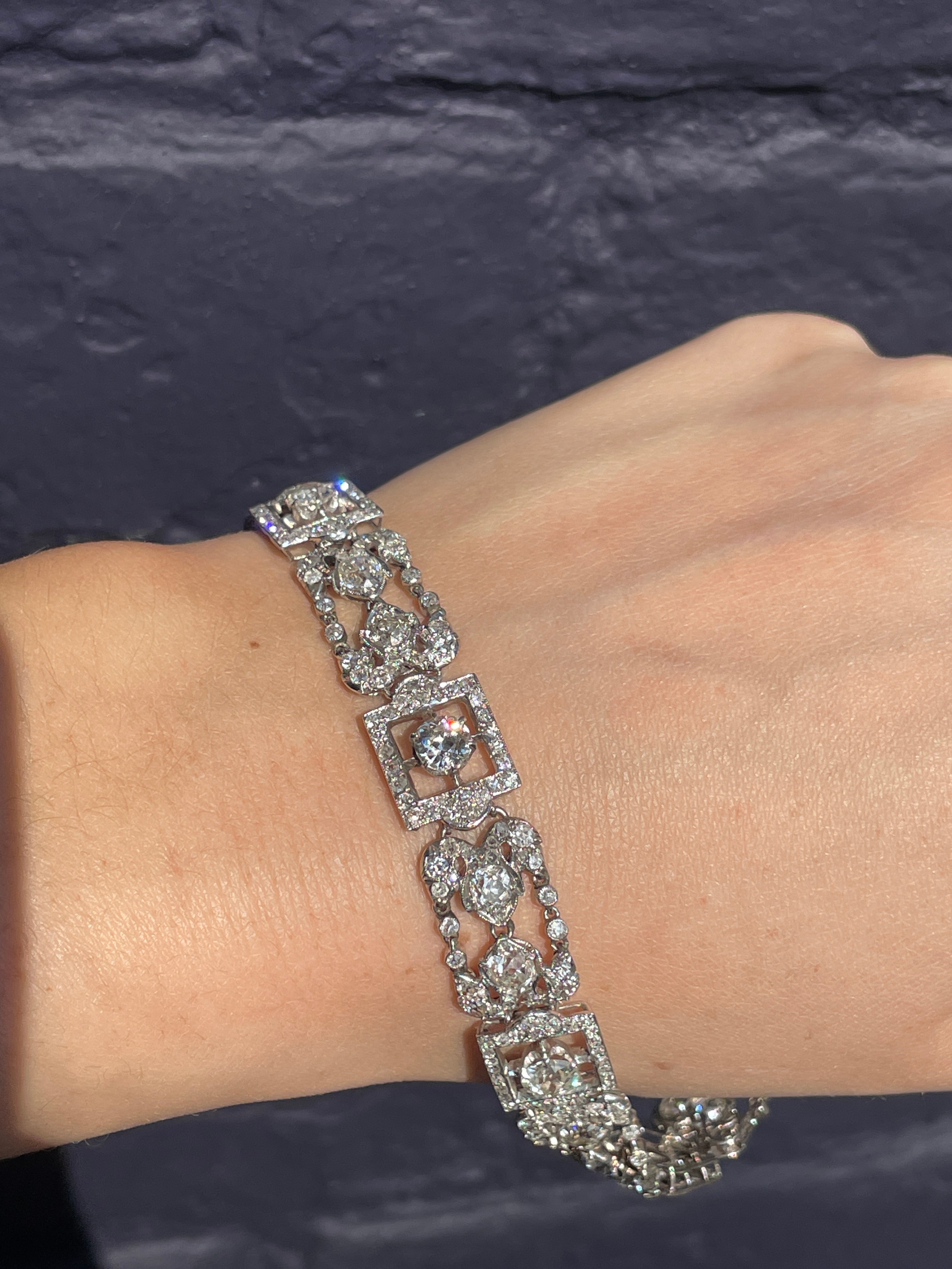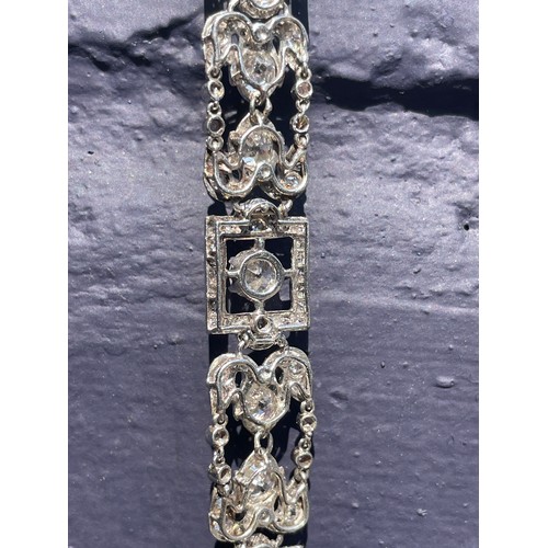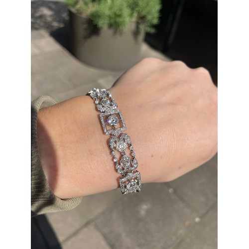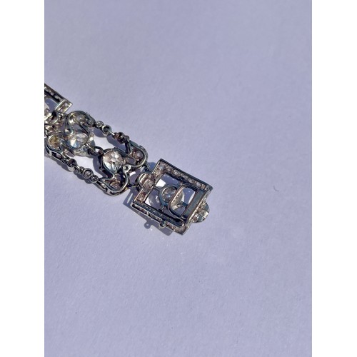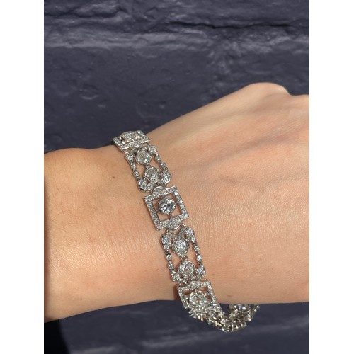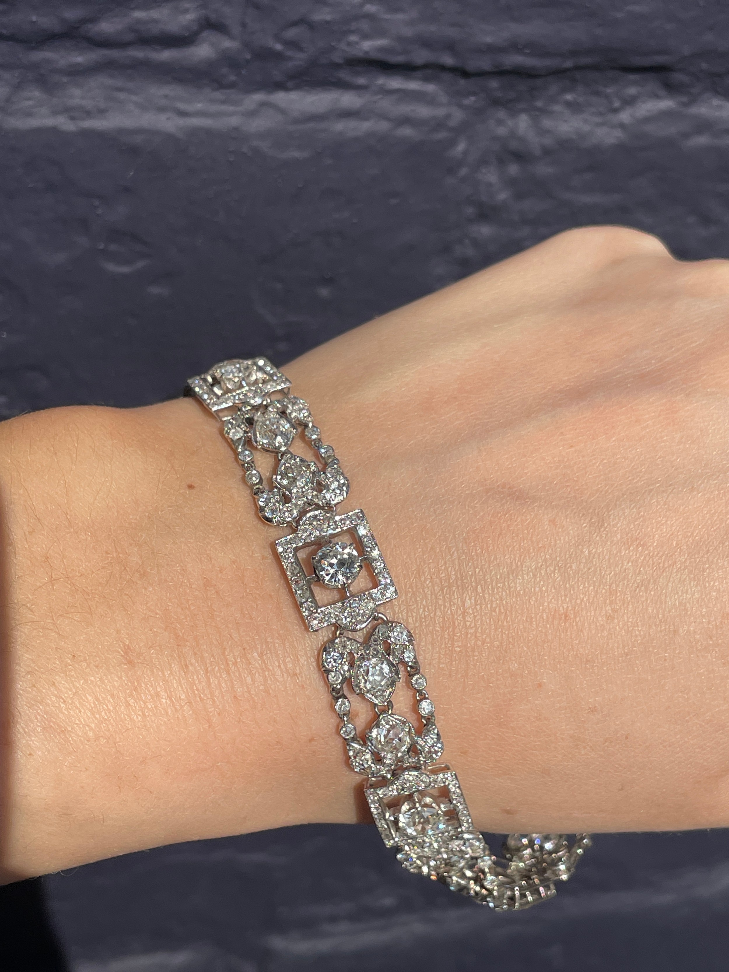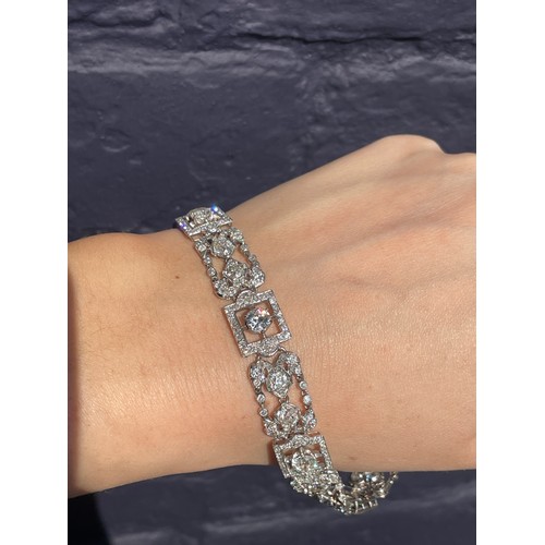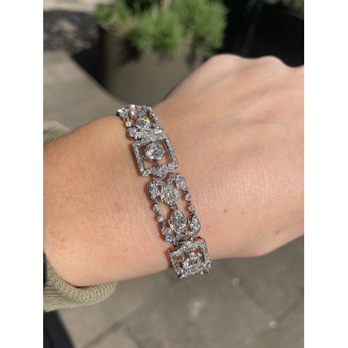 A beautiful Belle Époque diamond bracelet. Composed of square shaped sections with single old brilliant cut diamond centres. With highly flexible bell flower garland connecting links. Finely mounted in platinum, with French control marks