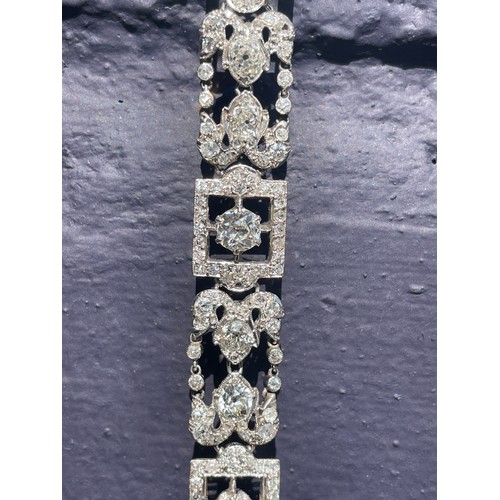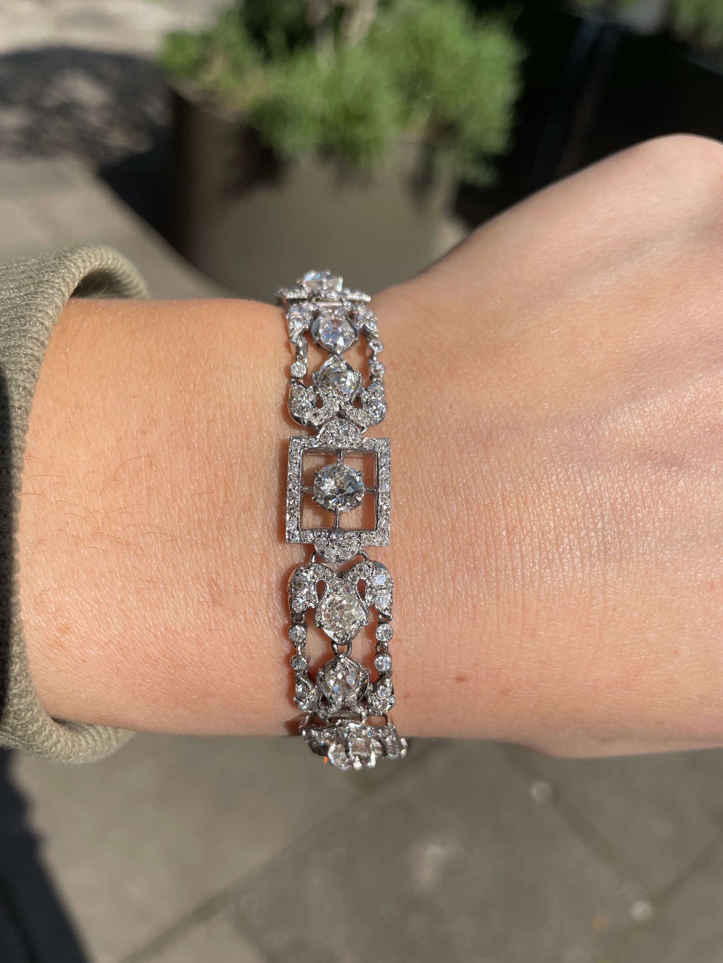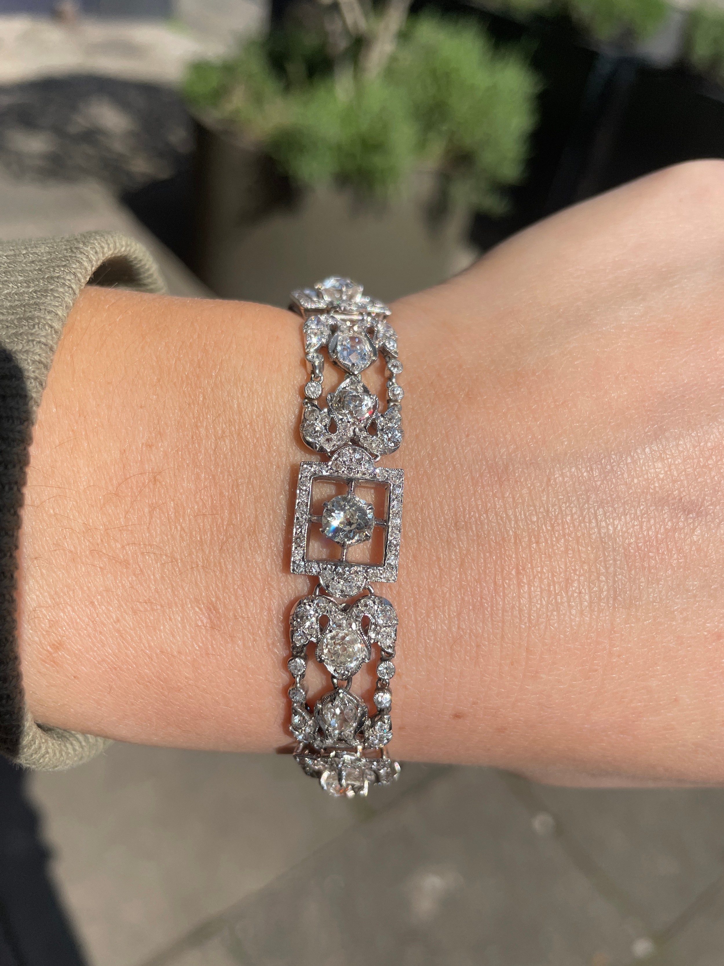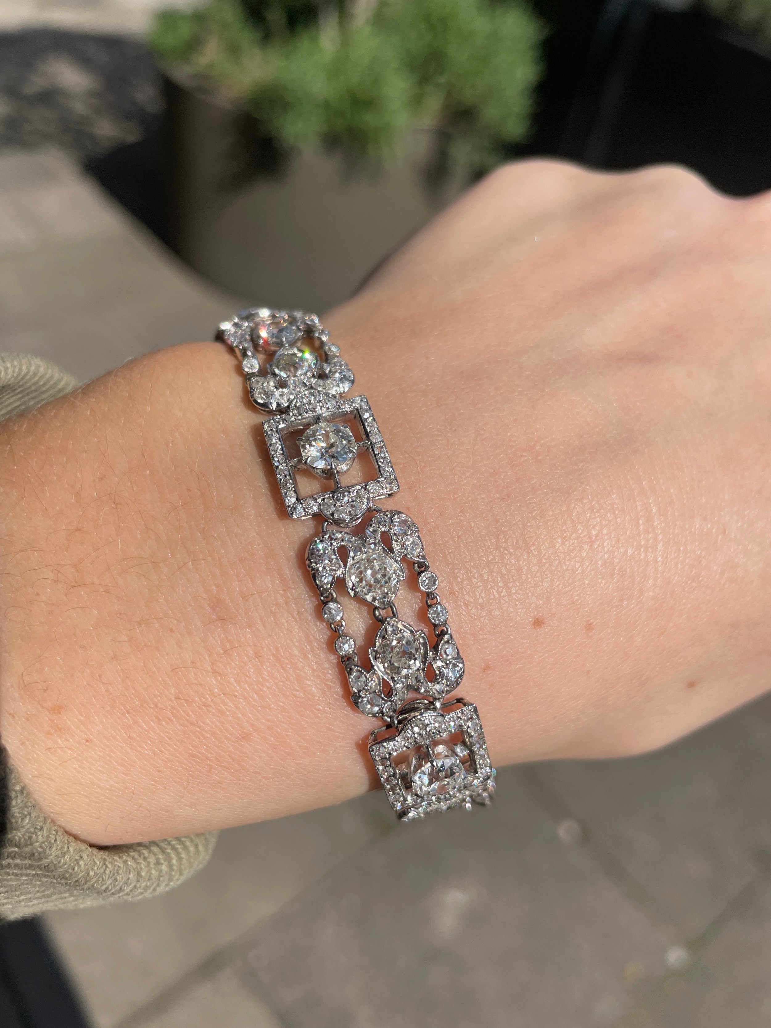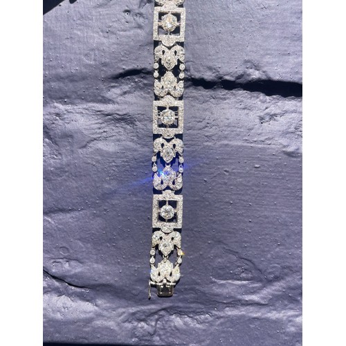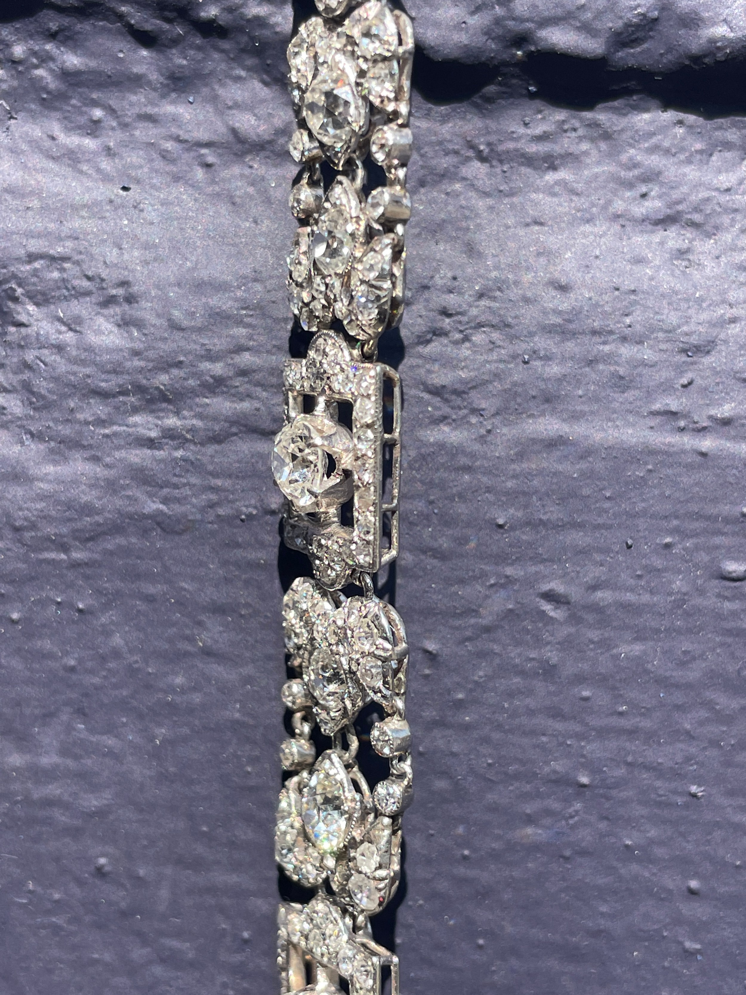 A beautiful Belle Époque diamond bracelet. Composed of square shaped sections with single old brilliant cut diamond centres. With highly flexible bell flower garland connecting links. Finely mounted in platinum, with French control marks