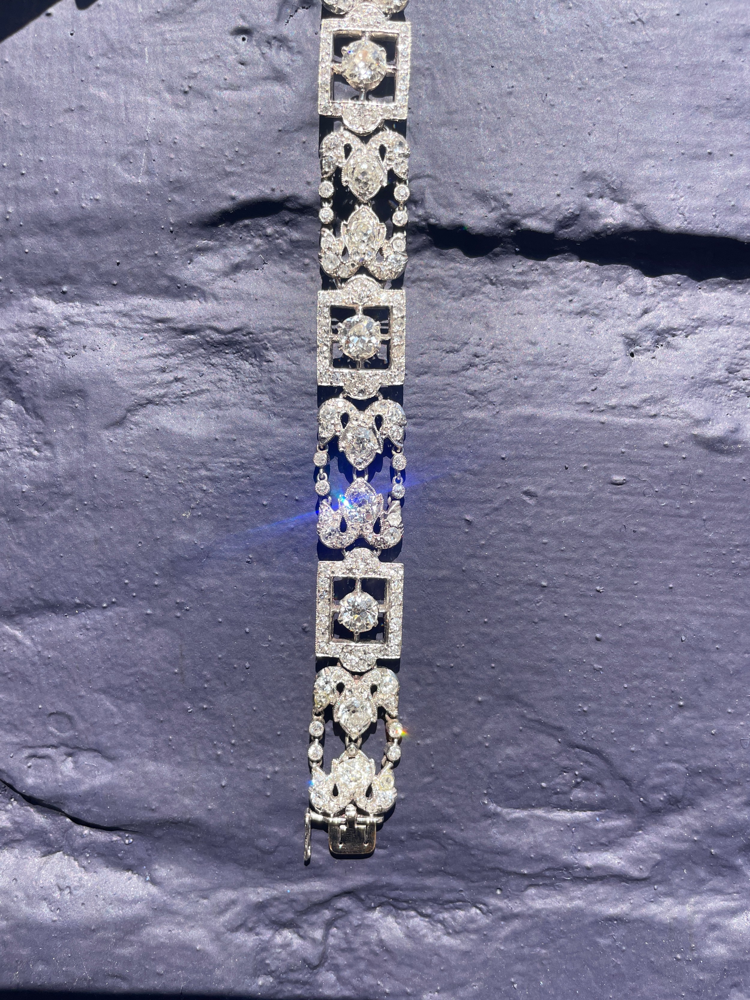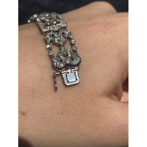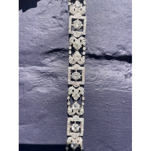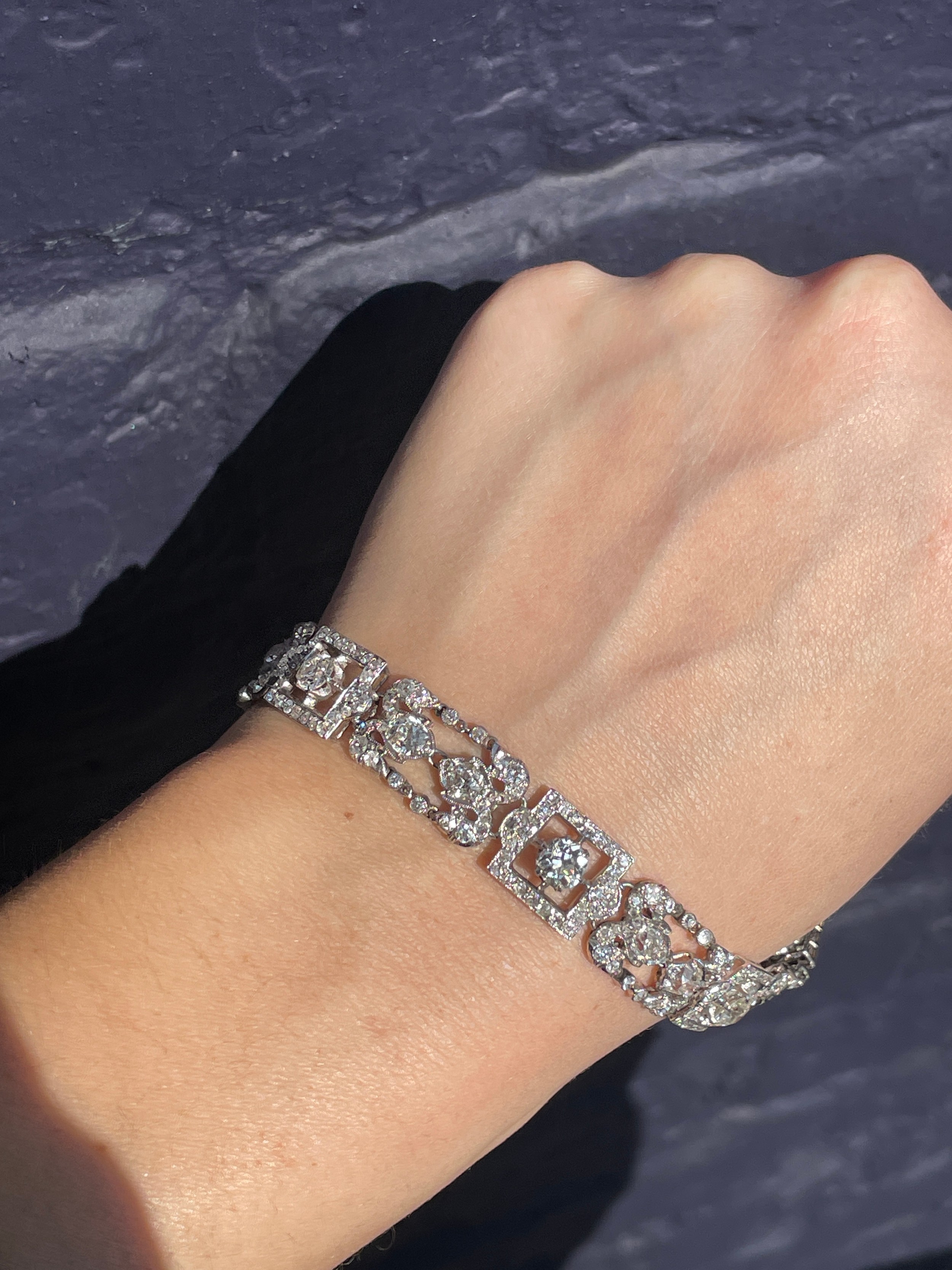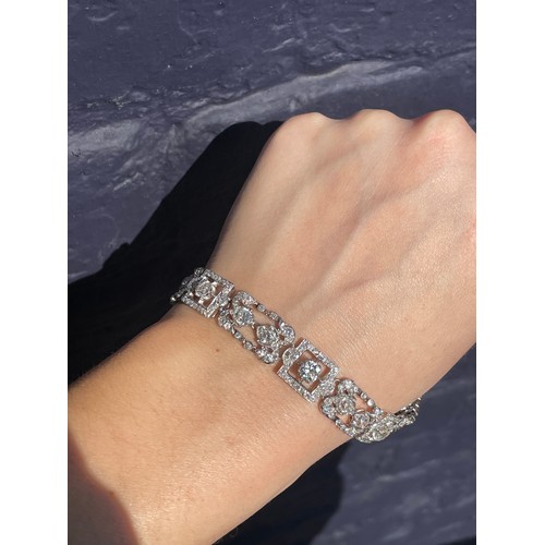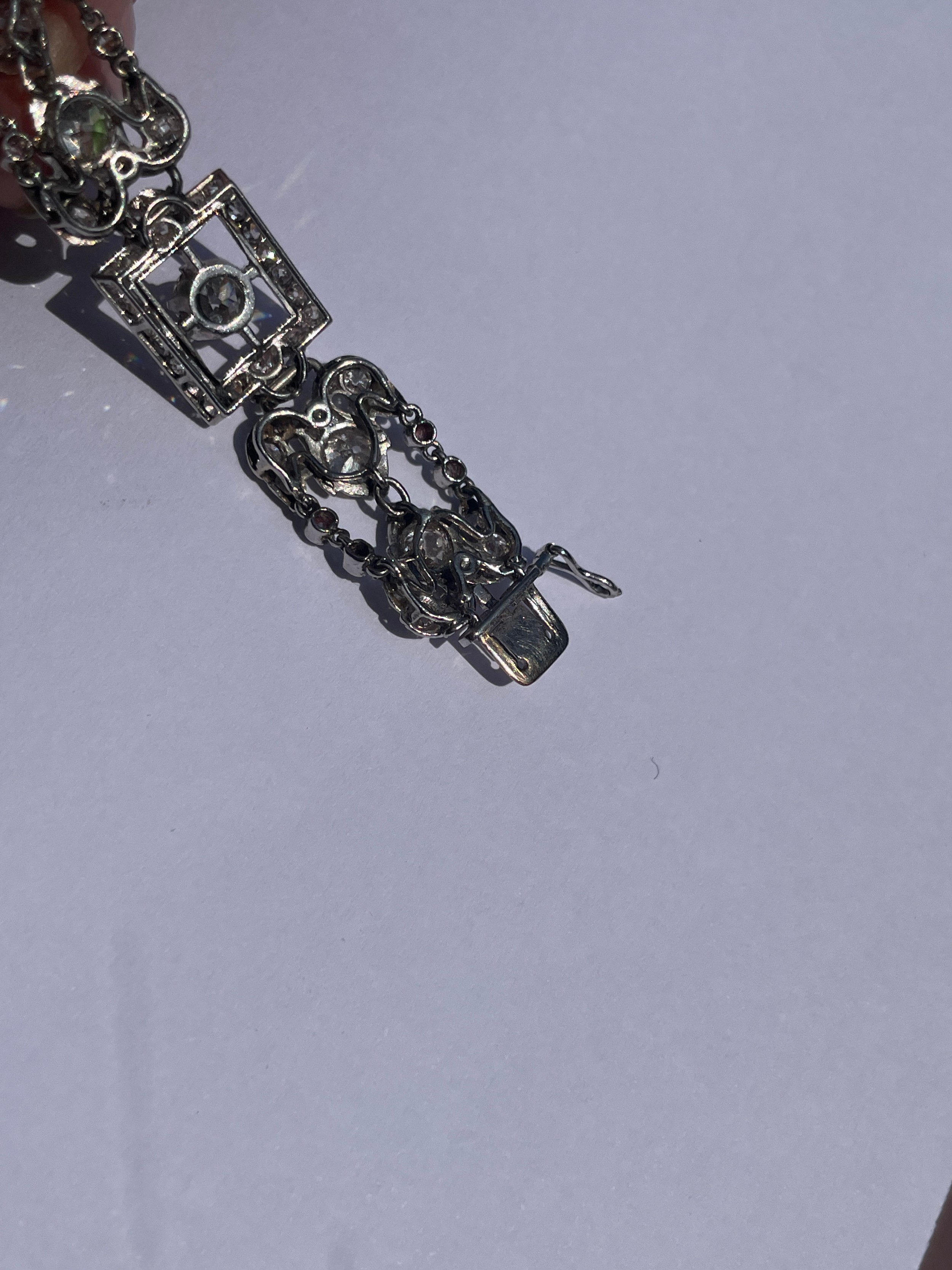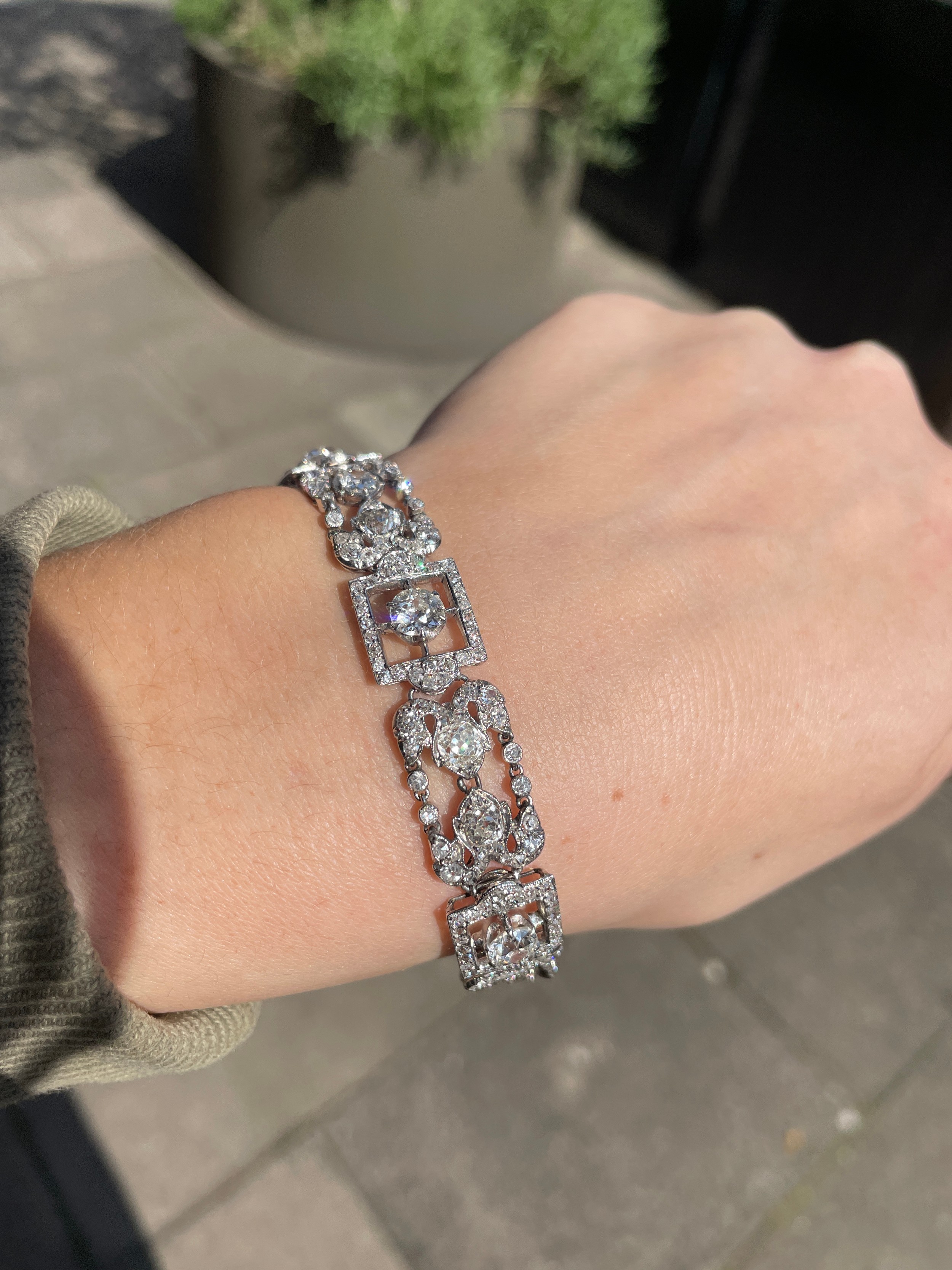 A beautiful Belle Époque diamond bracelet. Composed of square shaped sections with single old brilliant cut diamond centres. With highly flexible bell flower garland connecting links. Finely mounted in platinum, with French control marks