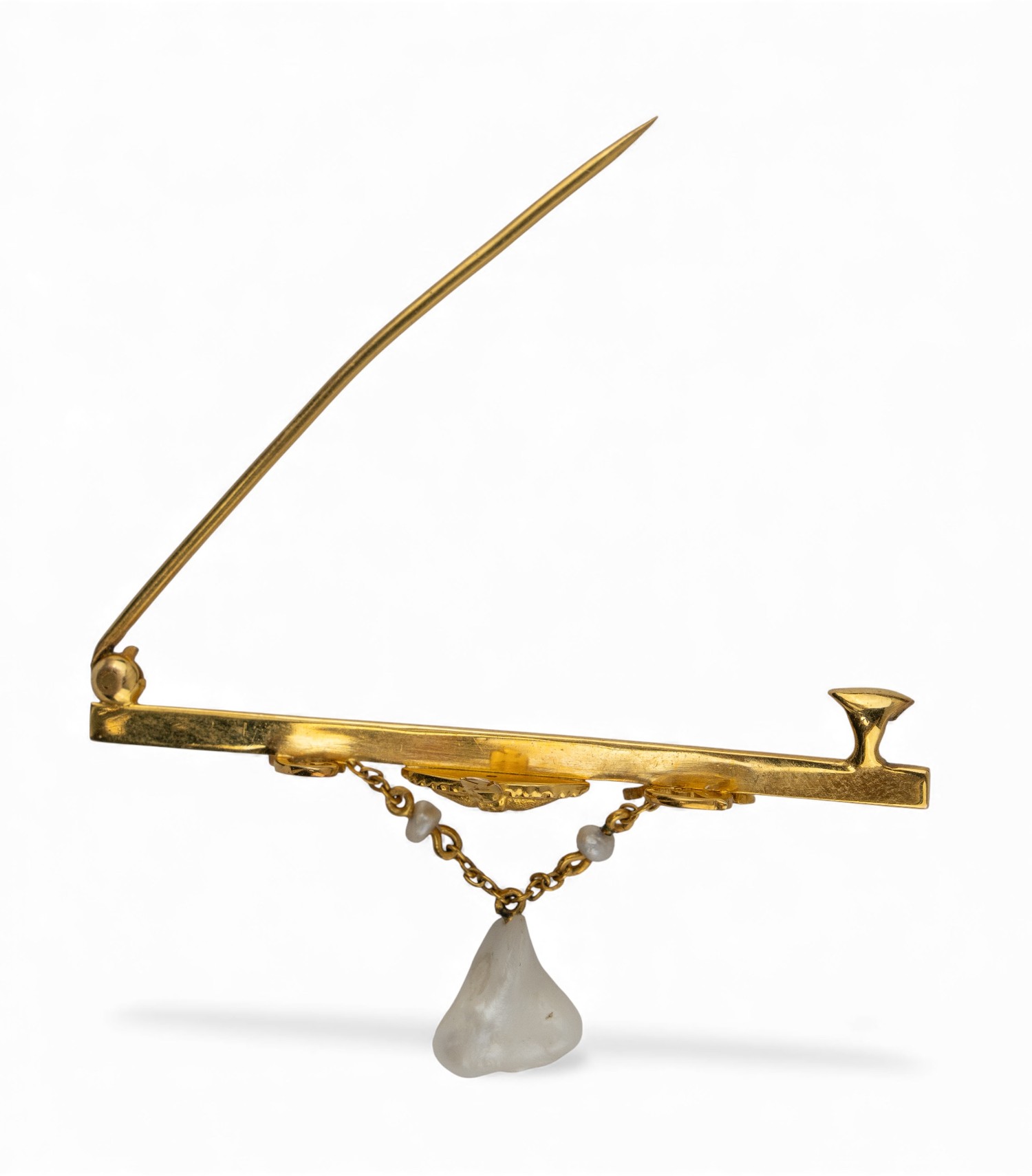 With a hanging baroque natural pearl, complete with a fitted tooled leather box.