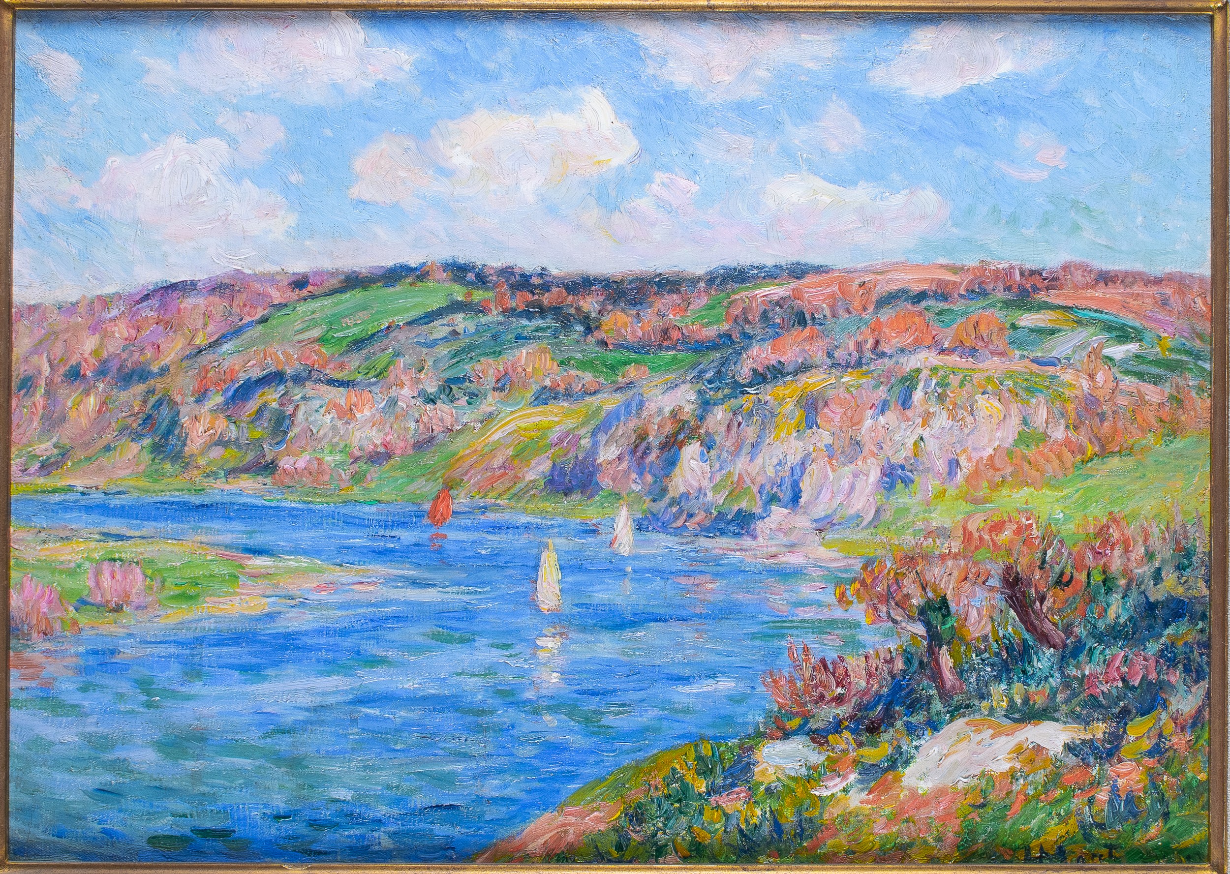 Along with Gustave Loiseau, and Maxime Maufra, Moret was part of the group of young artists who clustered around Gauguin at Pont-Aven. From 1891 Moret applied the principles of synthetism to his work: in particular, the massing of colour zones and reduction of tonal effects, and the establishment of clear planes in pictorial structure. This latter element was always to remain a characteristic feature of his work.