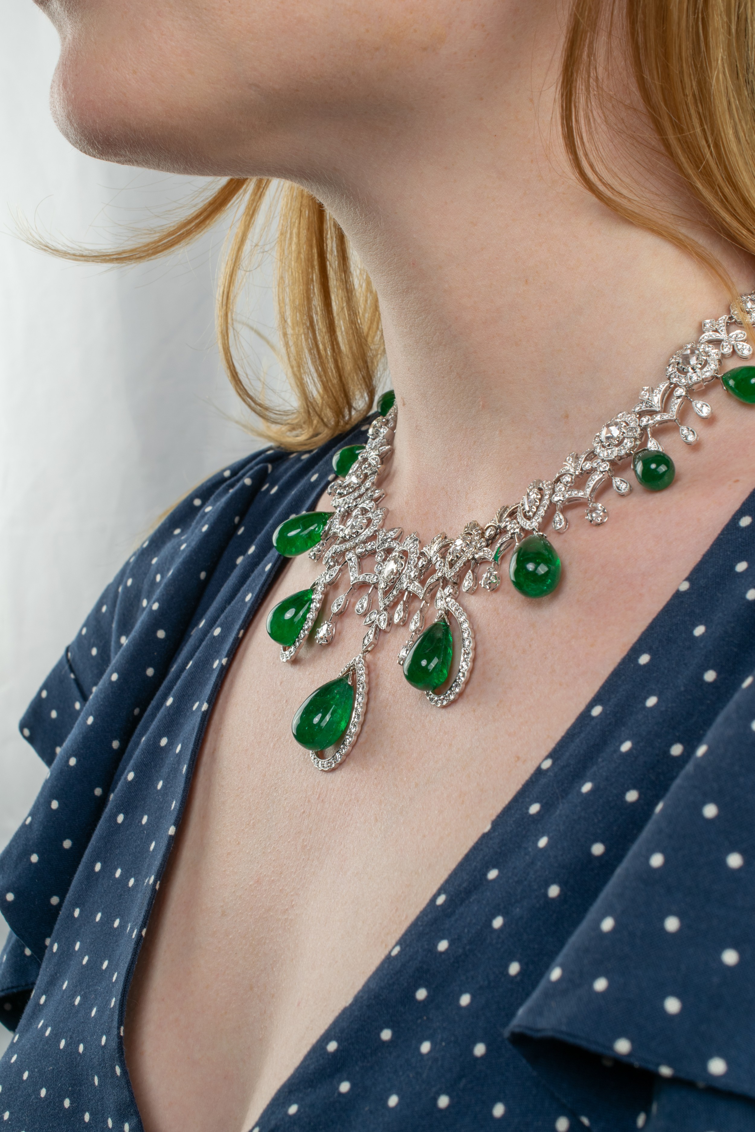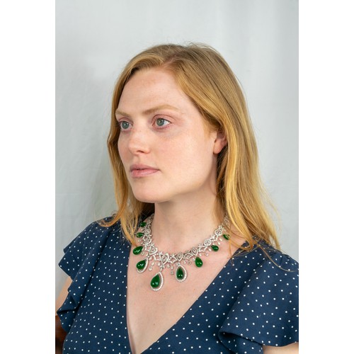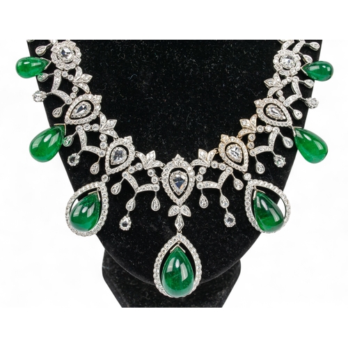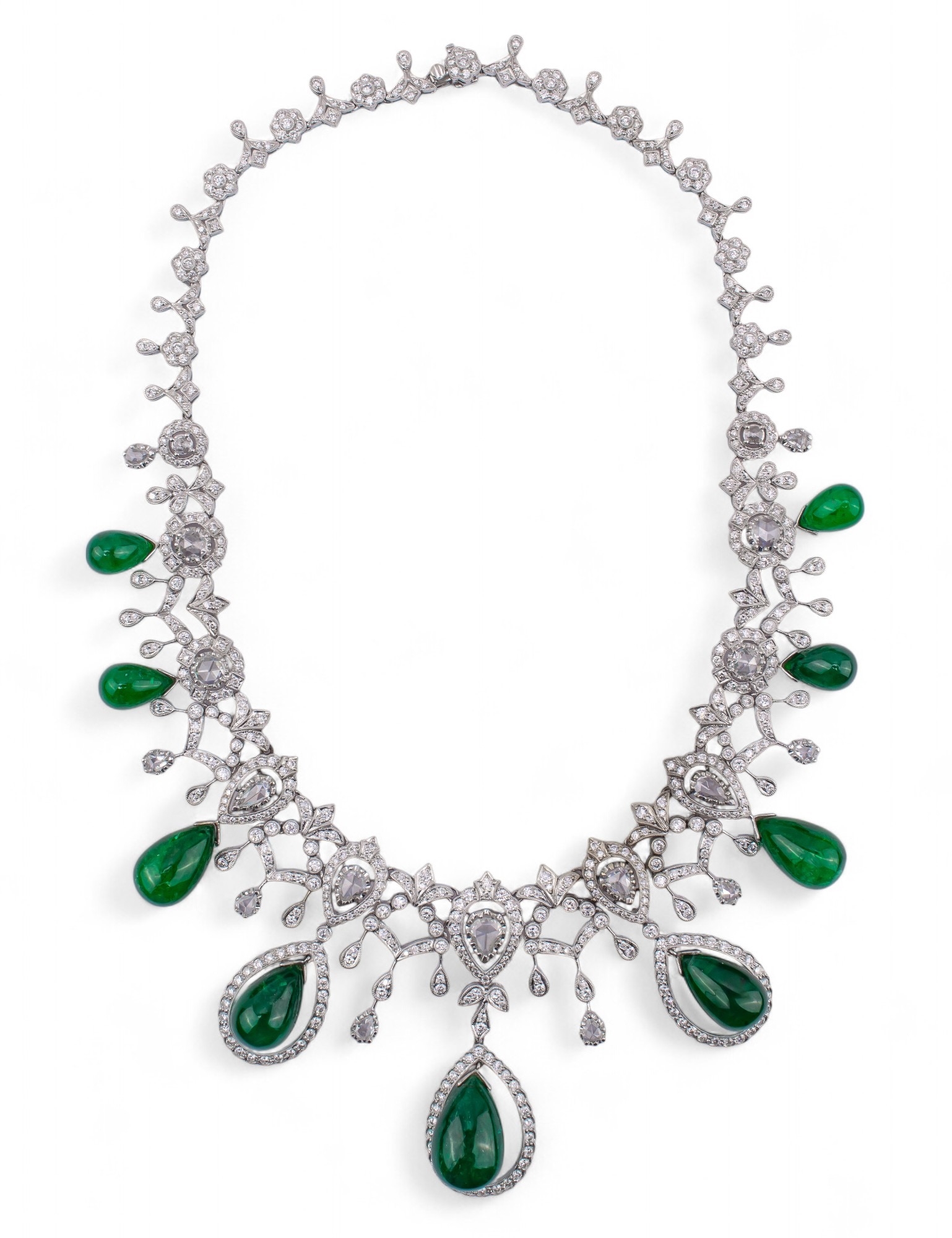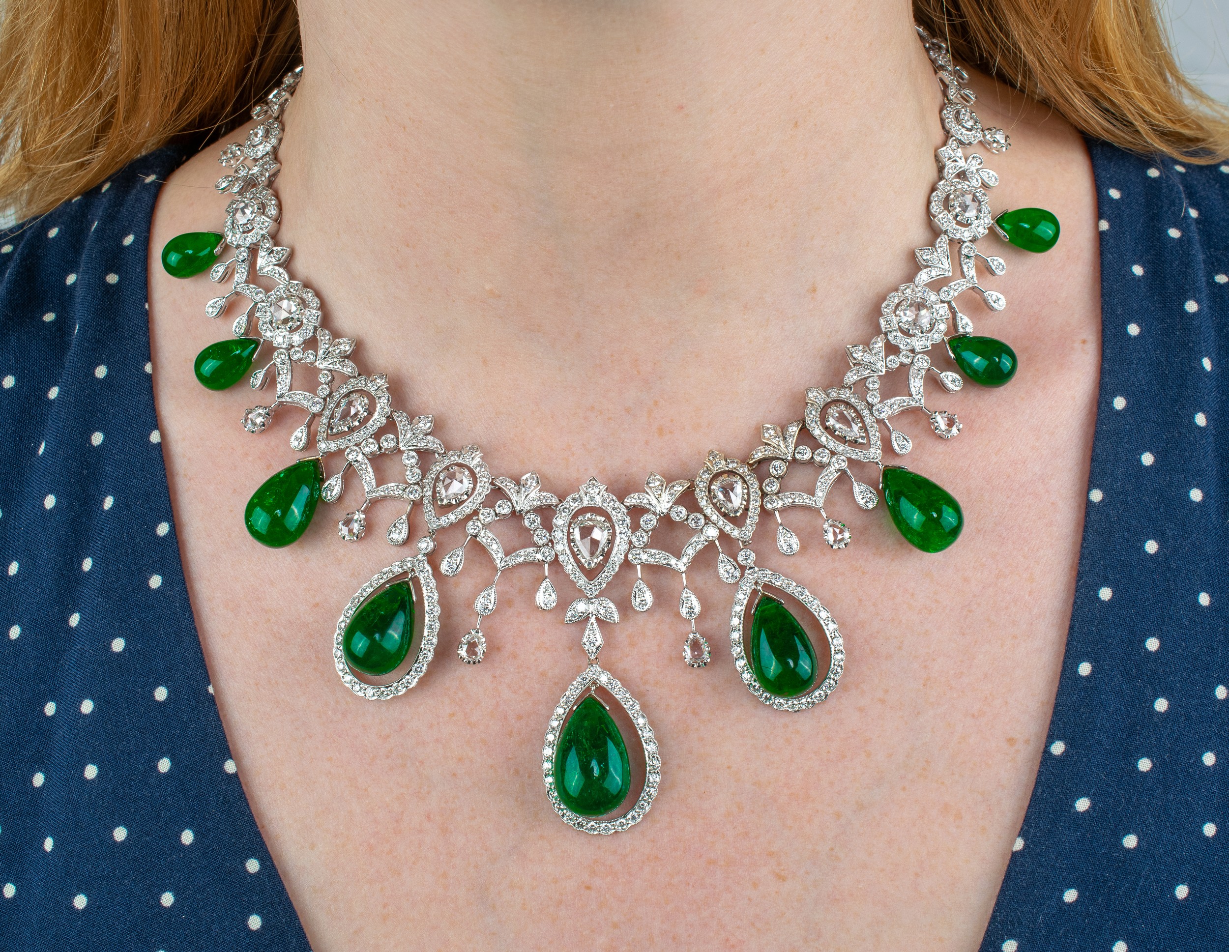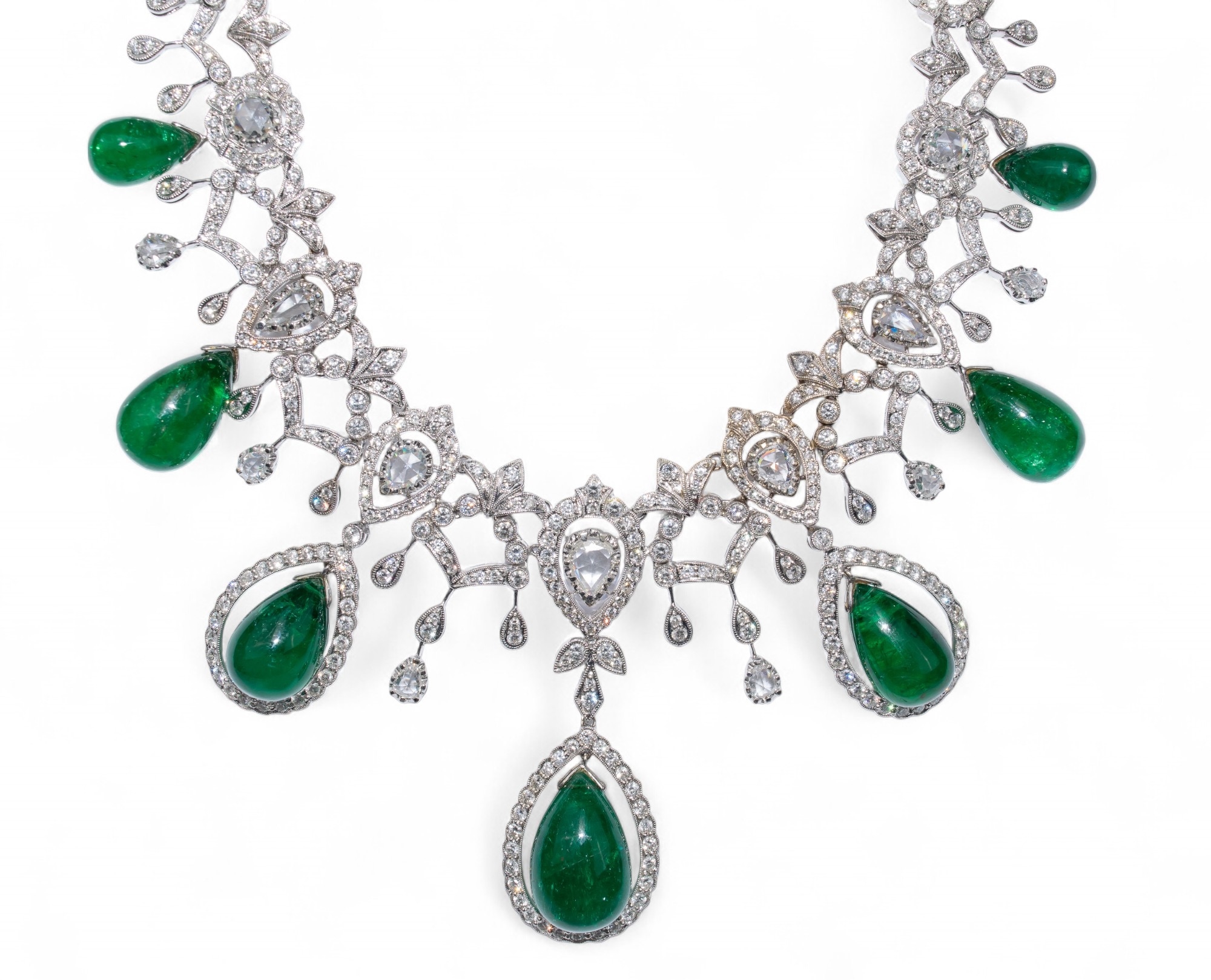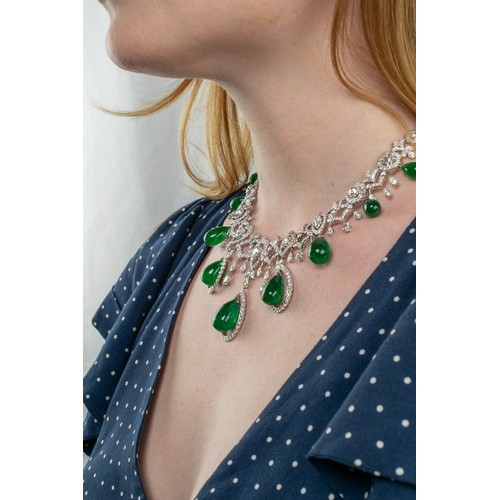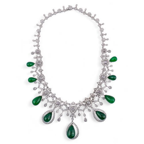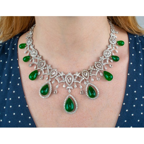 Consisting of nine cabochon cut drop emeralds of graduating size, of very good colour and weighing approximately 110 carats, set to a rose cut and brilliant cut diamond necklace, the diamonds weighing approximately 17 to 18 carats. Mounted in 18 carat white gold.