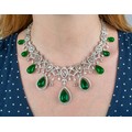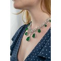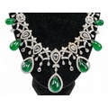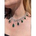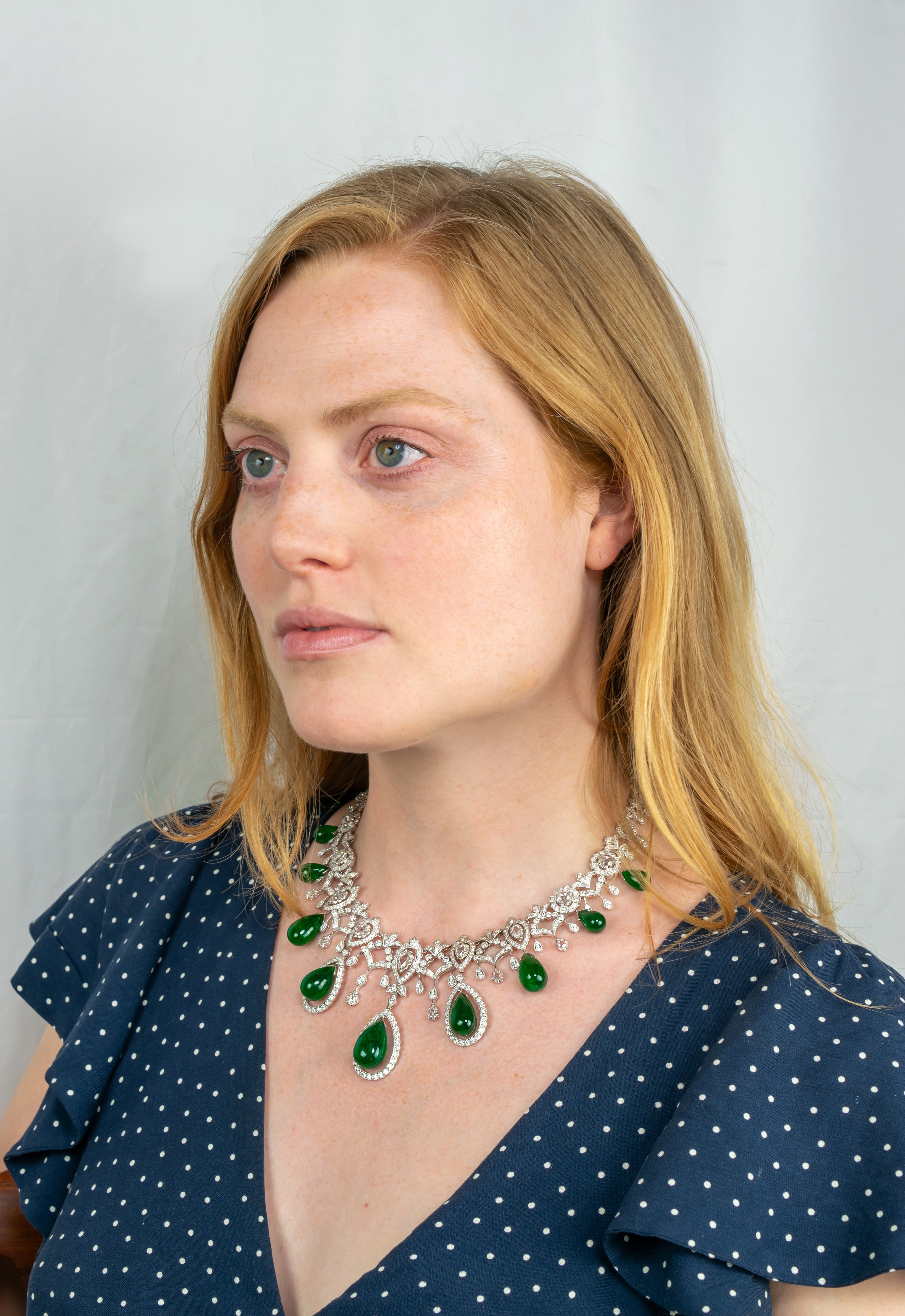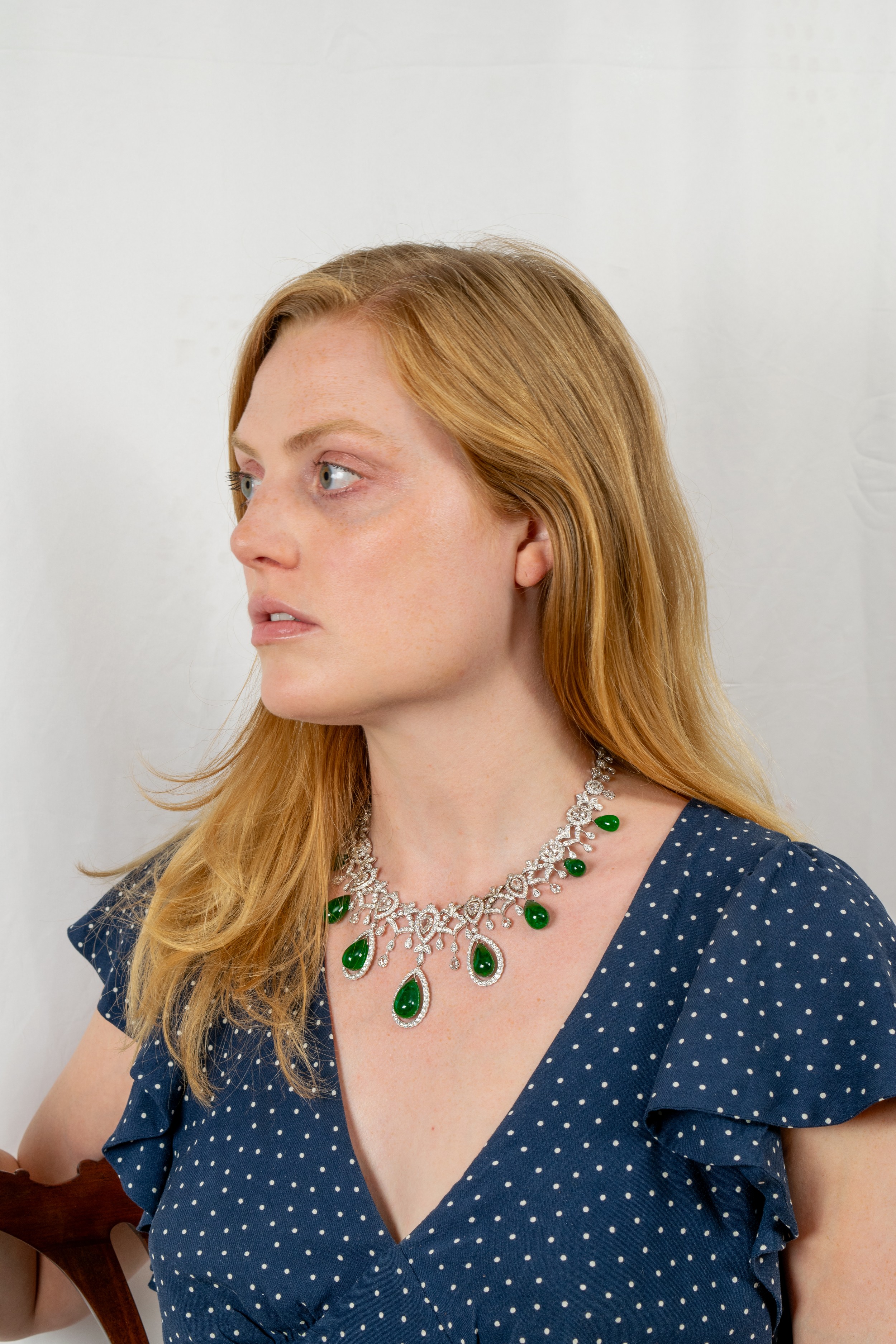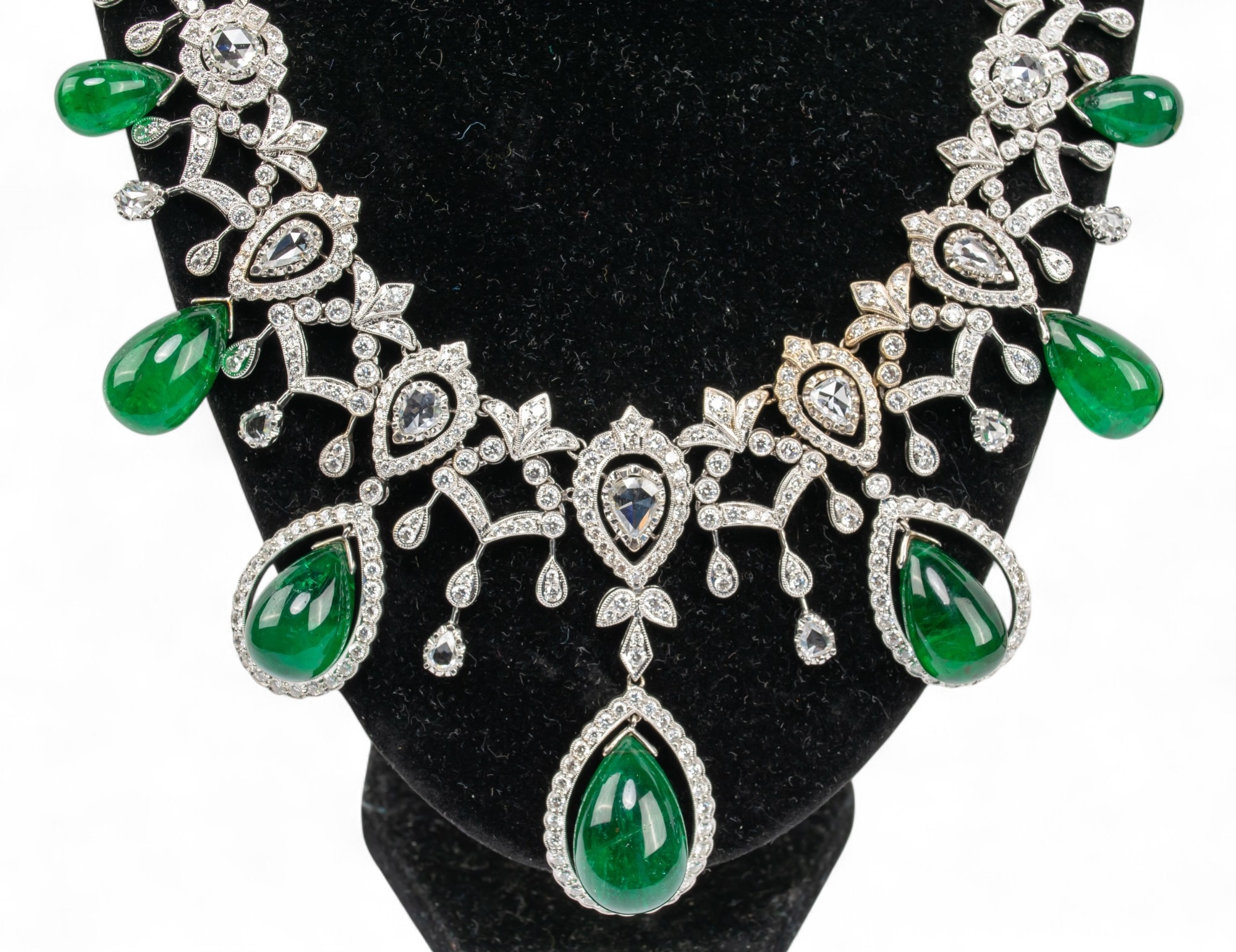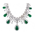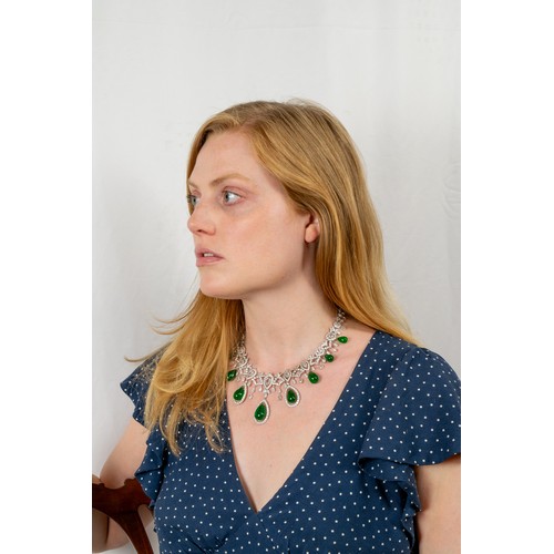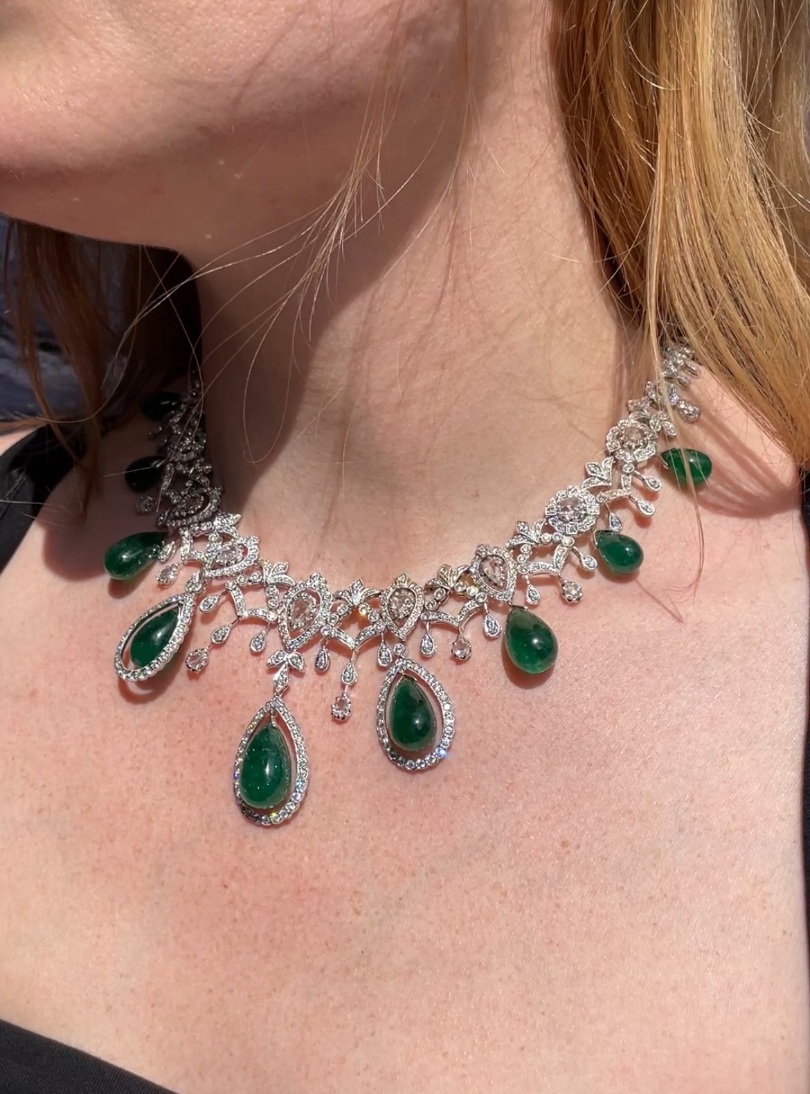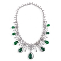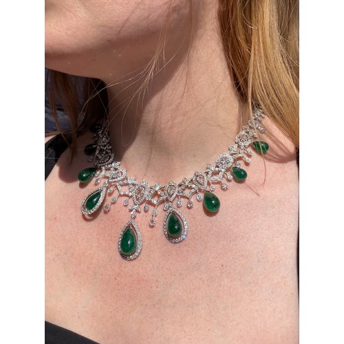 Consisting of nine cabochon cut drop emeralds of graduating size, of very good colour and weighing approximately 110 carats, set to a rose cut and brilliant cut diamond necklace, the diamonds weighing approximately 17 to 18 carats. Mounted in 18 carat white gold.