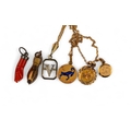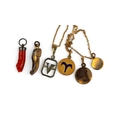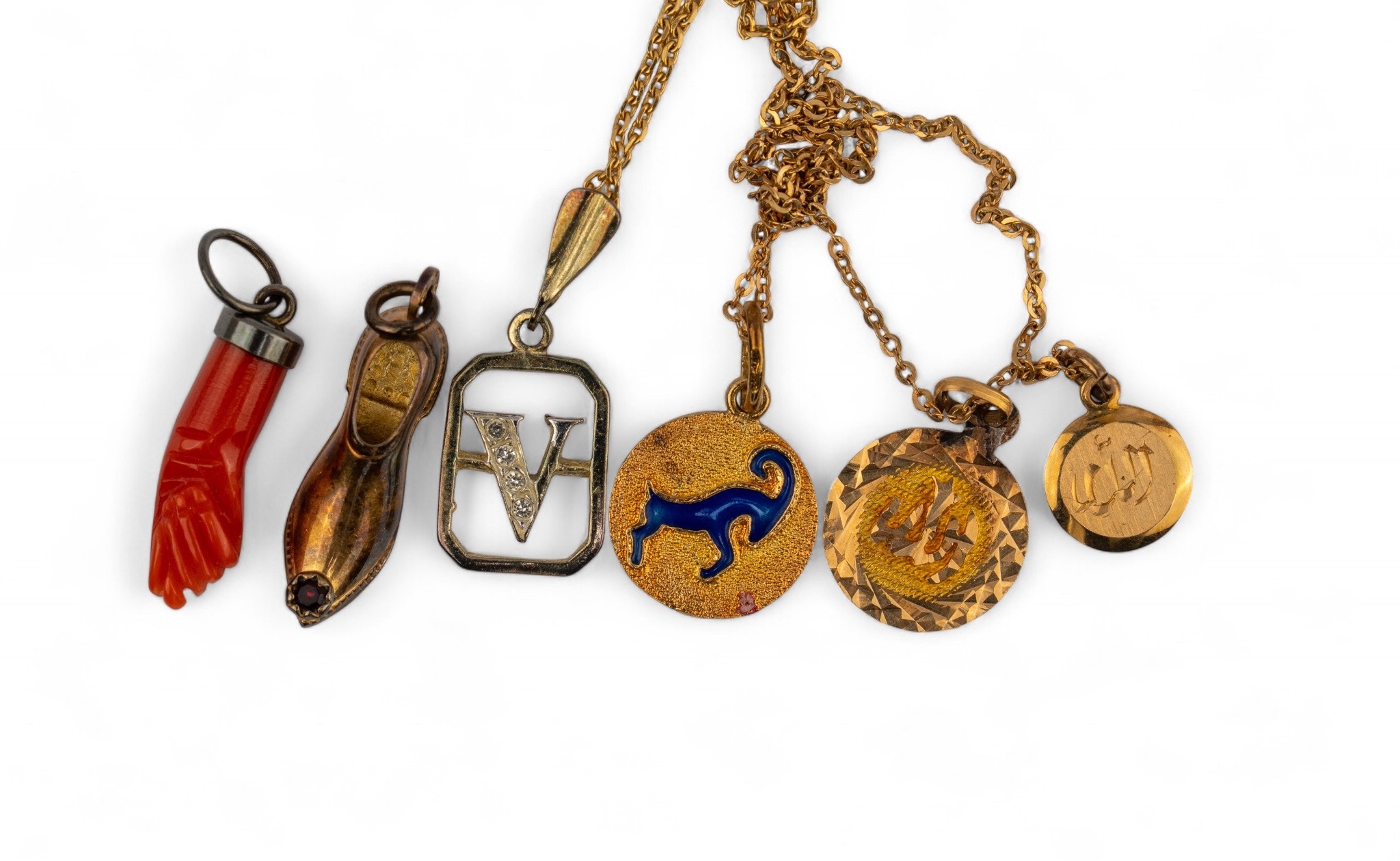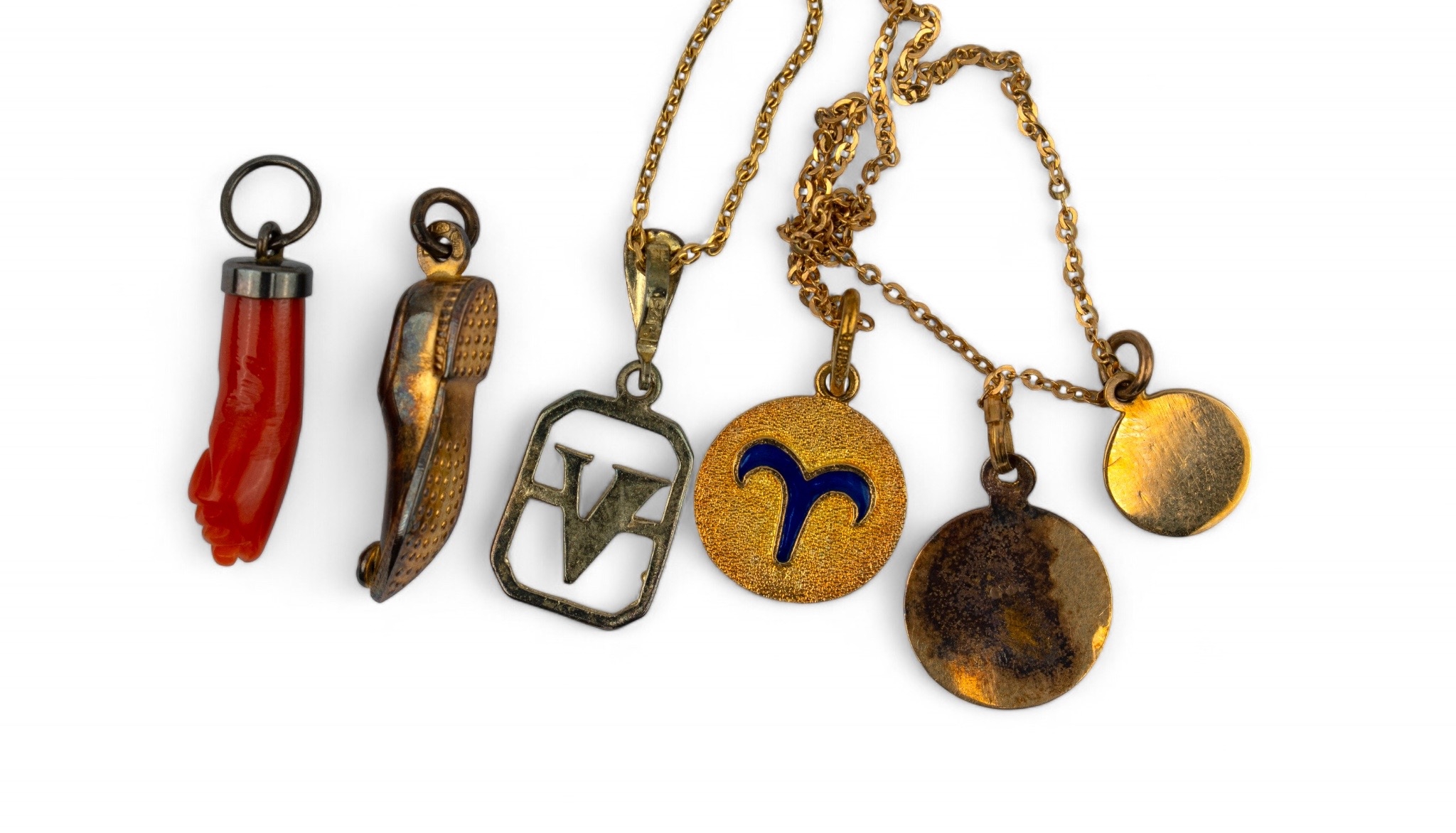 [c] Three small yellow gold pendants, and a silver 'V' pendant