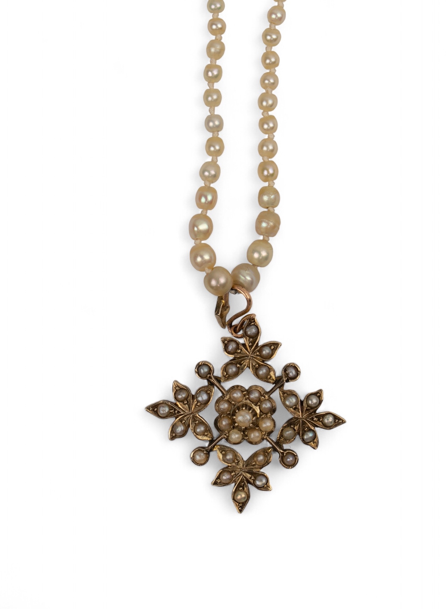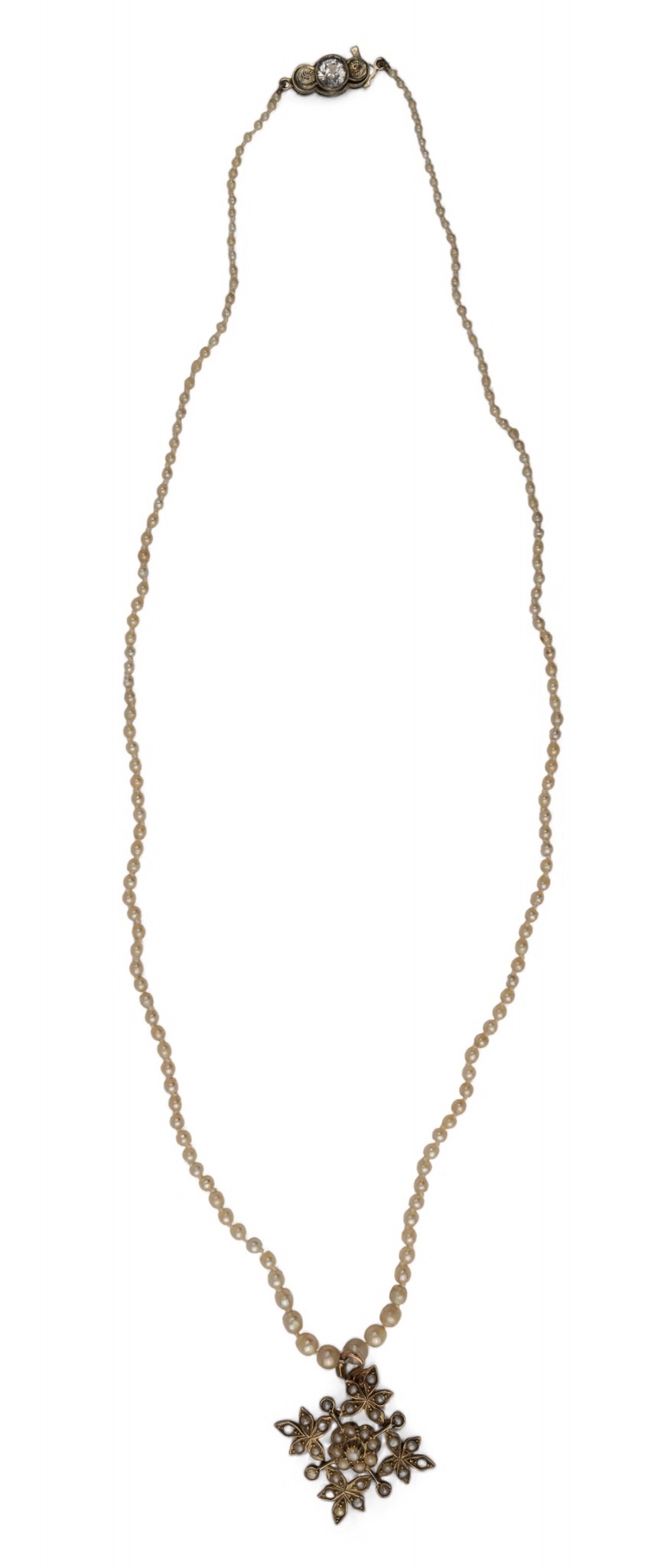 Antique, A graduated pearl necklace with a split pearl and 9k gold pendant