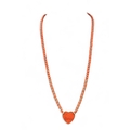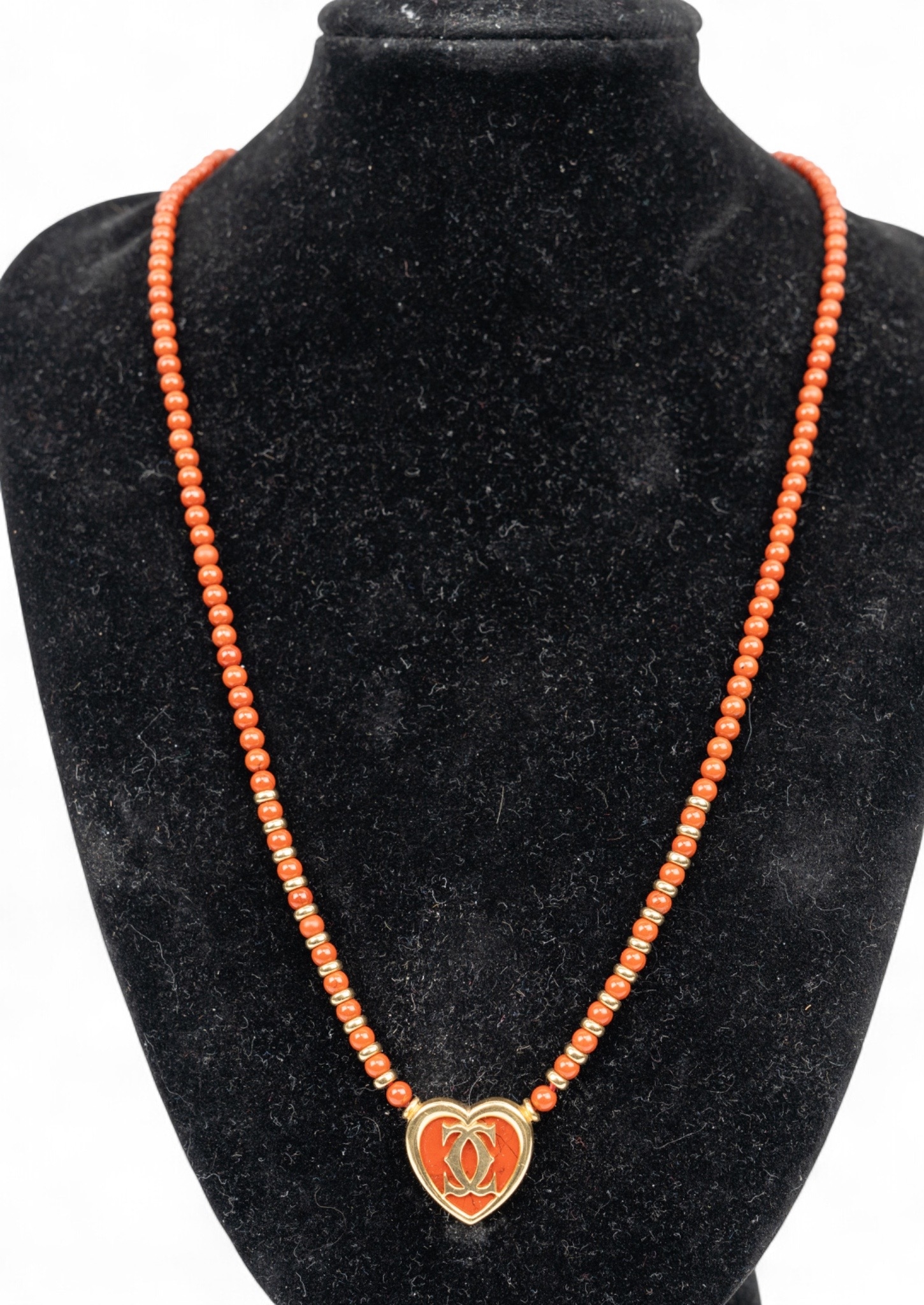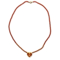 A heart-shaped yellow gold and jasper necklace. The heart-shaped centre set with jasper background and applied with entwined 'C' Cartier motif. On a jasper and gold bead chain.