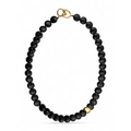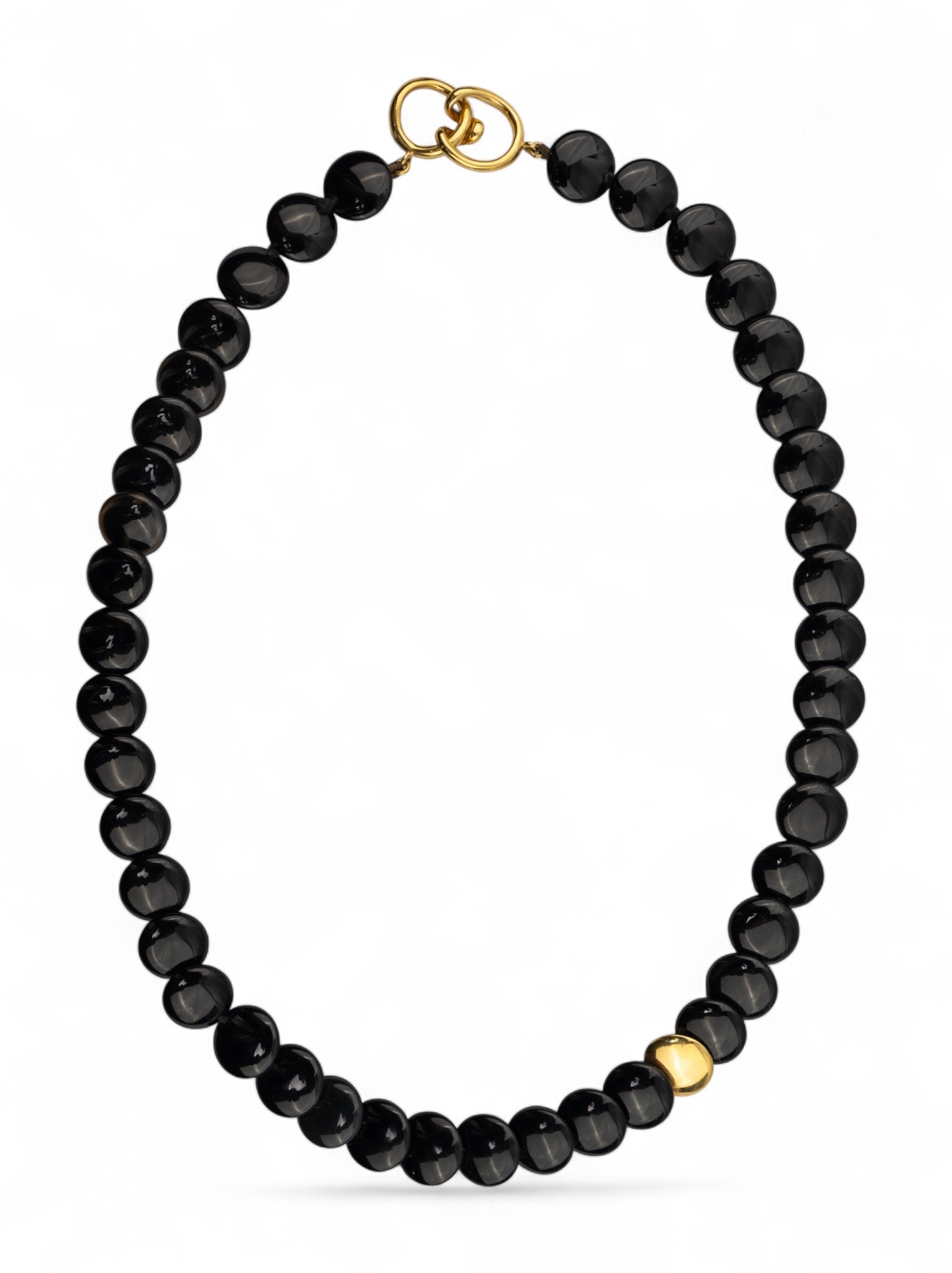 A black onyx and 18k yellow gold button necklace, composed of forty-two circular disc buttons, with a single solid 18k gold button to the front, and an 18k gold clasp.