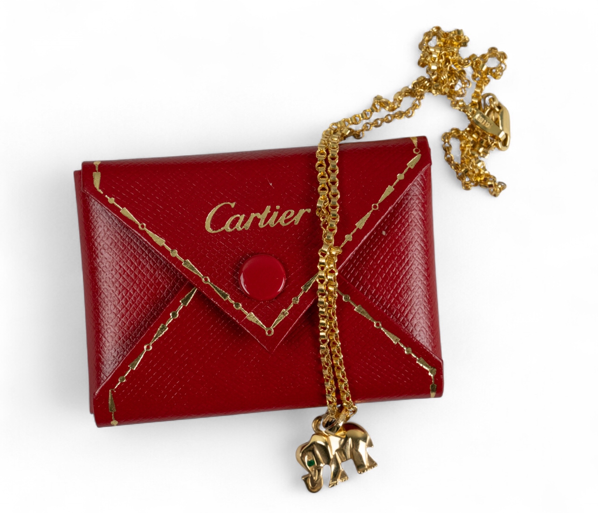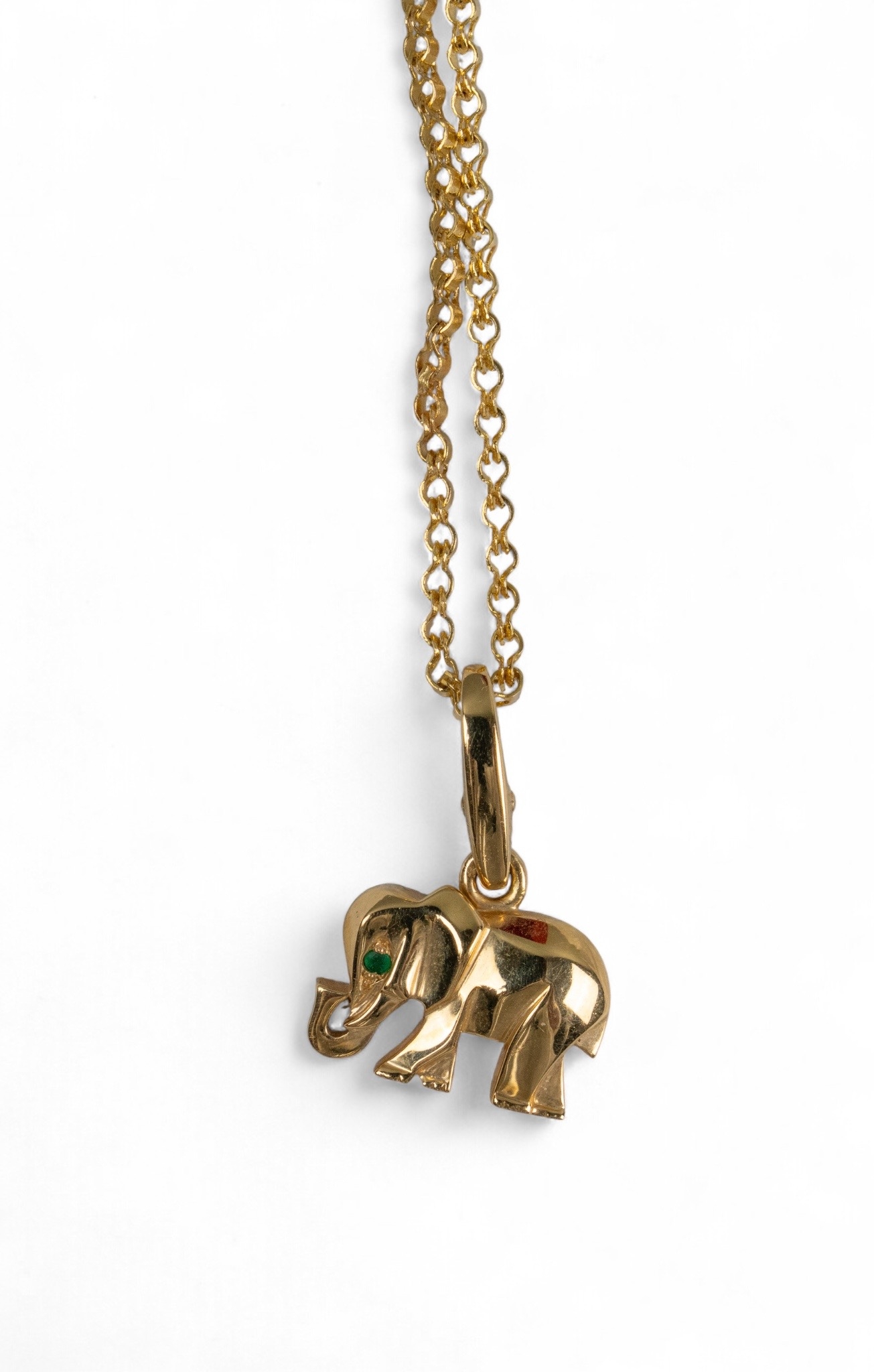 An 8k gold and emerald elephant pendant, numbered 815189. To an 18k gold chain.